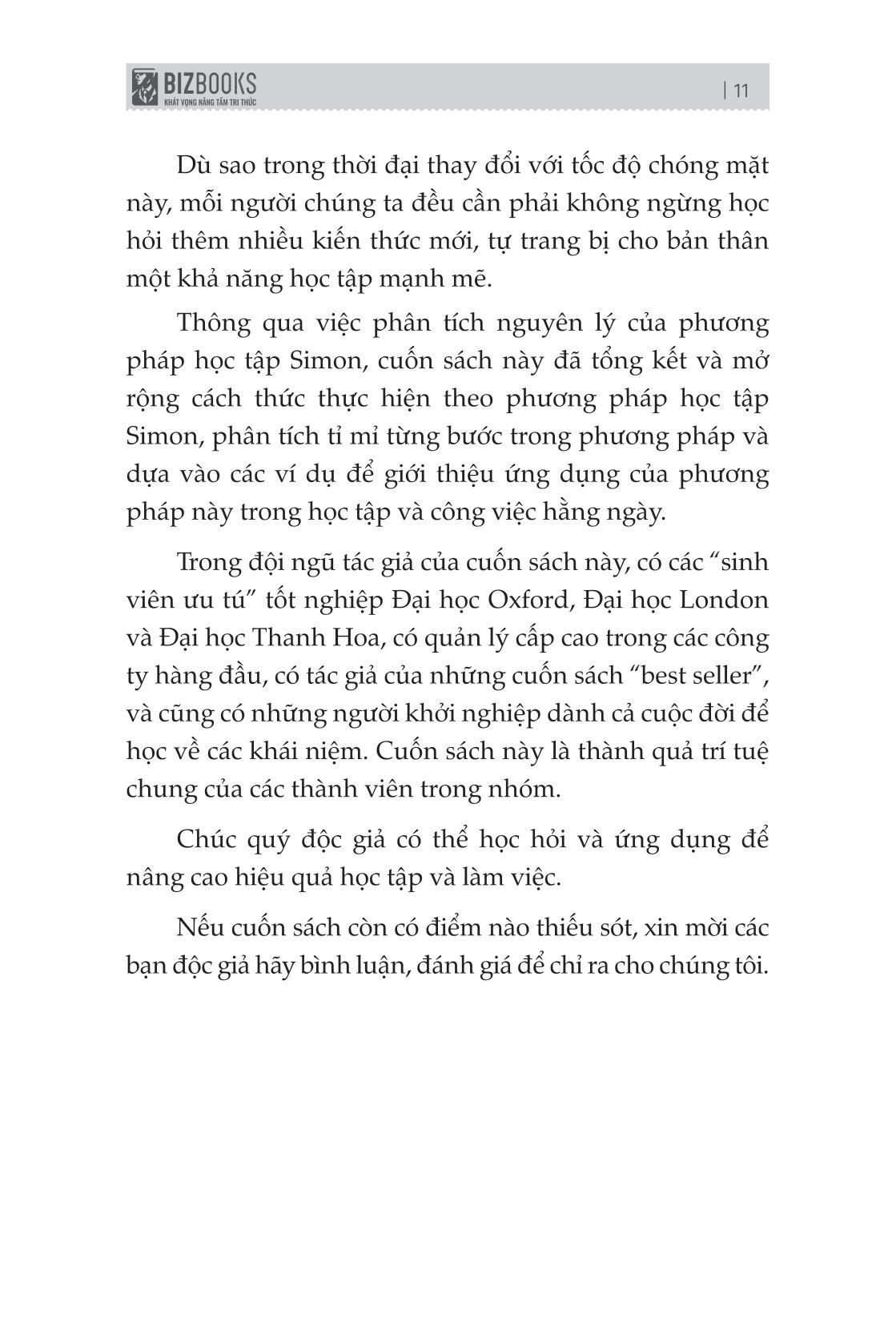 Trong cuốn “Phương pháp Simon - Cách học nhanh, nhớ lâu mọi kiến thức” đã chia sẻ những cách tiếp cận học tập đúng đắn, giúp người đọc có thể tập trung và hiểu được nội dung bài học một cách nhanh chóng hơn, từ cách xây dựng lộ trình học tập, quản lý thời gian cho đến cách nghiên cứu và đánh giá bài kiểm tra, tác giả đều cung cấp cho độc giả những gợi ý và phương pháp thực tiễn bám sát với thực tế chia nhỏ các kiến thức thành các “Chunking” (những điểm kiến thức) khác nhau để dễ dàng ghi nhớ