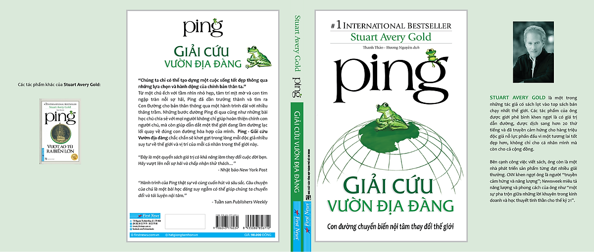 “PING – GIẢI CỨU VƯỜN ĐỊA ĐÀNG” Con đường chuyển biến nội tâm thay đổi thế giới Nối tiếp hành trình “Vượt ao tù ra biển lớn”, Ping dấn bước vào cuộc phiêu lưu thứ ba đi tìm nguyên nhân và giải pháp cho những thay đổi bất thường của tự nhiên: Giải cứu Vườn địa đàng. Trong phiên bản mới nhất này, “Ping – Giải cứu Vườn địa đàng” gồm cả ba phần: Vượt khỏi ao tù; Hành trình ra biển lớn và phần mới nhất: Giải cứu Vườn địa đàng, mang đến cho người đọc một câu chuyện hoàn chỉnh về hành trình đầy thú vị của chú ếch Ping. Sau chuyến hành trình đầu tiên, vượt khỏi ao tù thành công, đến hành trình thứ hai cuộc hành hương ra biển lớn với hai chú ếch trẻ là Daikon và Hodo, và bây giờ Ping trở lại cuộc phiêu lưu thứ 3 đi tìm nguyên nhân và giải pháp cho những thay đổi bất thường của tự nhiên. Ping gặp rắc rối bởi những dấu hiệu đáng lo ngại về sự mất cân bằng ngày càng tăng trong Eden Pond, buộc chú phải dấn thân vào chuyến phiêu lưu vĩ đại nhất từ trước đến nay của mình: hành trình dẫn dắt thế giới đang lầm đường lạc lối quay về đúng con đường hòa hợp của mình. Thông qua những chuyến đi đến những vùng đất mới, gặp gỡ những sinh vật mới và cả những chuyến đi vào chính tâm tưởng của mình, Ping đã rút ra được cho bản thân cũng như chia sẻ cho muôn loài những bài học quý giá, những chân lý tưởng chừng như giản đơn nhưng có giá trị muôn đời: Ai cũng có thể tạo dựng một cuộc sống tốt đẹp thông qua những lựa chọn và hành động của chính bản thân. Điểm đặc biệt của quyển sách này chính là tác giả Stuart Avery Gold đã “ban” cho loài vật nhân cách để truyền tải những triết lý sống một cách nhẹ nhàng nhưng rất thuyết phục. Đây còn được xem là “cuốn thiền vỡ lòng” dành cho độc giả vì những thông điệp và bài học sâu sắc mà nó truyền tải. Cũng giống như con người, loài vật phải nỗ lực hết mình để sống cuộc đời của chúng, chứ không phải chỉ là tồn tại một cách đơn thuần. Rằng ai trong chúng ta cũng có khả năng sống một cuộc đời trọn vẹn với những khát vọng sâu sắc nhất thông qua những lựa chọn và hành động của bản thân. Hành trình của Ping chính là nguồn cảm hứng mạnh mẽ cho tất cả những ai đang cần một cú hích để bật nhảy thật xa. Chỉ khi nào bắt đầu hành trình dám thay đổi để thoát ra khỏi những giới hạn do mình tự dựng lên, để tìm thấy chính mình thì bạn mới có thể sống một cuộc đời có chủ đích. Nếu nói một vài cuốn sách có thể thay đổi cách bạn nghĩ, một vài cuốn khác lại thay đổi cách bạn sống, thì “Ping – Giải cứu Vườn địa đàng” làm được cả hai điều đó. Người nổi tiếng nói gì về cuốn sách