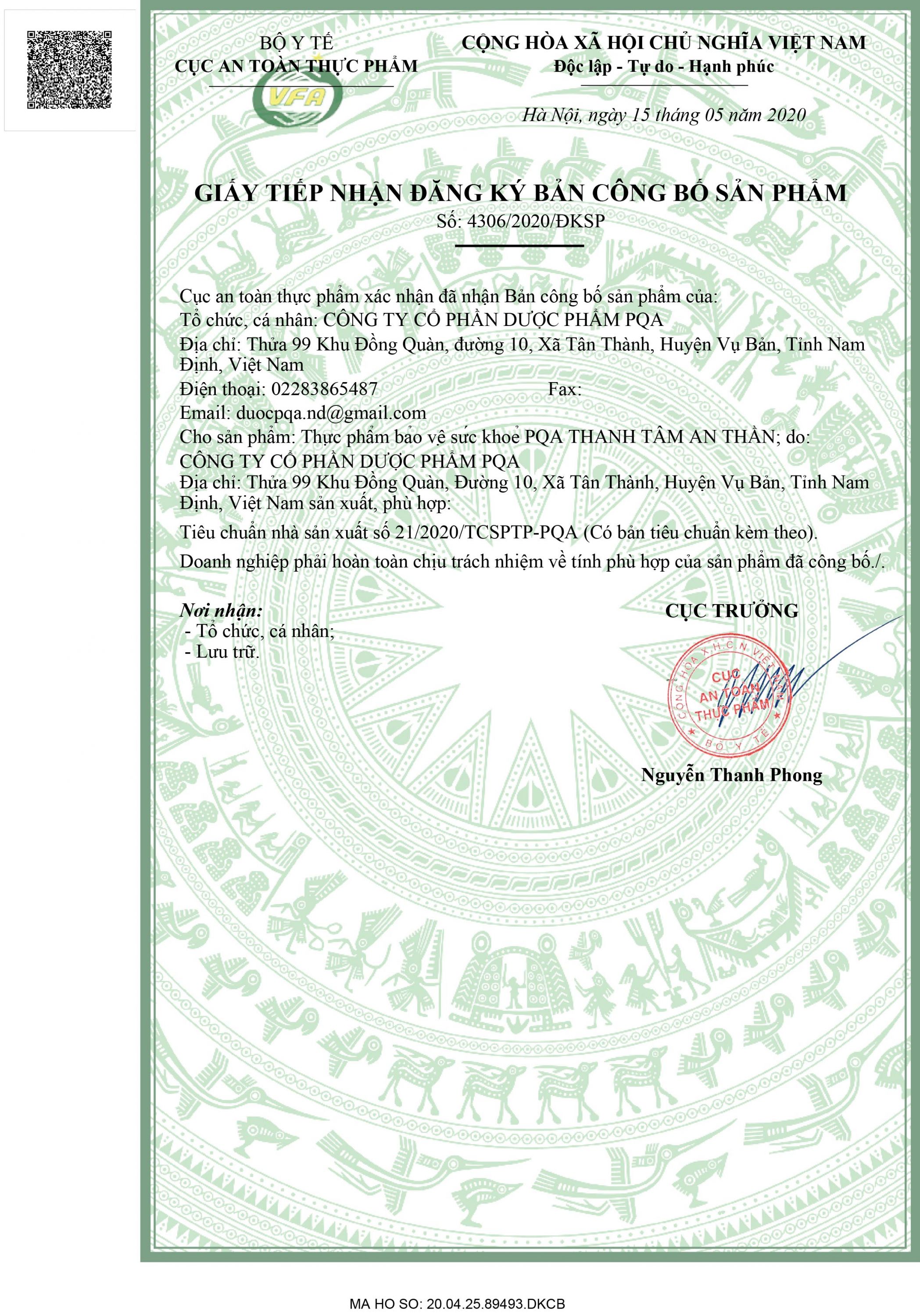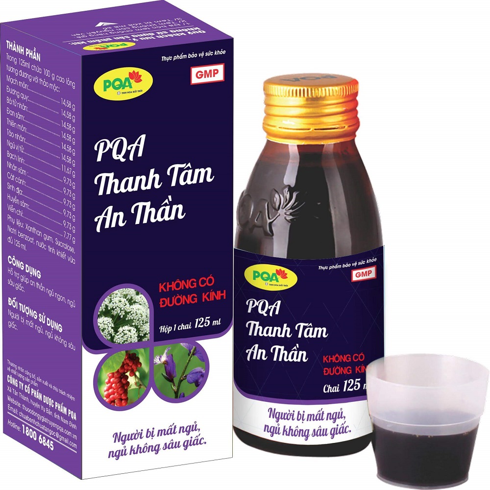 THÔNG TIN PQA THANH TÂM AN THẦN PQA Thanh Tâm An Thần là dược phẩm hỗ trợ giúp an thần ngủ ngon, ngủ sâu giấc cho người bị mất ngủ, thiếu ngủ, không ngủ sâu giấc. Thành phần: Trong 125ml chứa 100g cao lỏng tương đương với thảo mộc. Mạch môn: 14,58g Đương quy: 14,58g Bá tử nhân: 14,58g Đan sâm: 14,58g Thiên môn: 14,58g Táo nhân: 14,58g Ngũ vị tử: 11,67g Bạch linh: 9,73g Nhân sâm: 9,73g Cát cánh: 9,73g Sinh địa: 9,73g Huyền sâm: 9,73g Viễn chí: 7,77g Phụ liệu vừa đủ 125ml. Công dụng Hỗ trợ giúp an thần ngủ ngon, ngủ sâu giấc. Đối tượng sử dụng Người bị mất ngủ, ngủ không sâu giấc. Cách dùng: Ngày uống 2 lần, 1 lần trước khi ăn tối và 1 lần trước khi đi ngủ. Trẻ em từ 6-12 tuổi: Mỗi lần uống 10ml Trẻ em trên 12 tuổi: Mỗi lần uống 20ml. Người lớn: Mỗi lần uống 30ml. Mỗi đợt dùng 3 tháng. Nên dùng 2 – 3 đợt. Lưu ý: Có lắng cao thảo mộc, lắc đều uống hết. Không dùng quá 4 tuần sau lần mở nắp đầu tiên. Cảnh báo về sức khỏe Không dùng cho phụ nữ có thai hoặc đang cho con bú, người mẫn cảm với bất kỳ thành phần nào của sản phẩm này. Tham khảo ý kiến thầy thuốc trước khi sử dụng sản phẩm. Thực phẩm này không phải là thuốc, không có tác dụng thay thế thuốc chữa bệnh. Bảo quản: Bảo quản ở nhiệt độ phòng không quá 30 độ C, tránh ánh sáng. Hạn sử dụng 36 tháng kể từ ngày sản xuất. Ngày sản xuất và hạn sử dụng in trên bao bì. Số XNQC: 2134/2020/XNQC-ATTP Số đăng ký: 4306/2020/ĐKSP