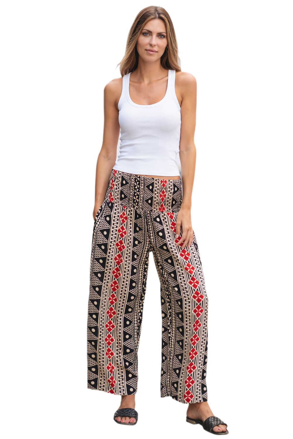 Quần Boho chất liệu lụa mềm mại, họa tiết ấn tượng. Bo thun co giãn ở lưng. Dây cột nơ ở eo (có thể cột phía trước hoặc sau eo). Phom rộng. Dài quần 105cm
