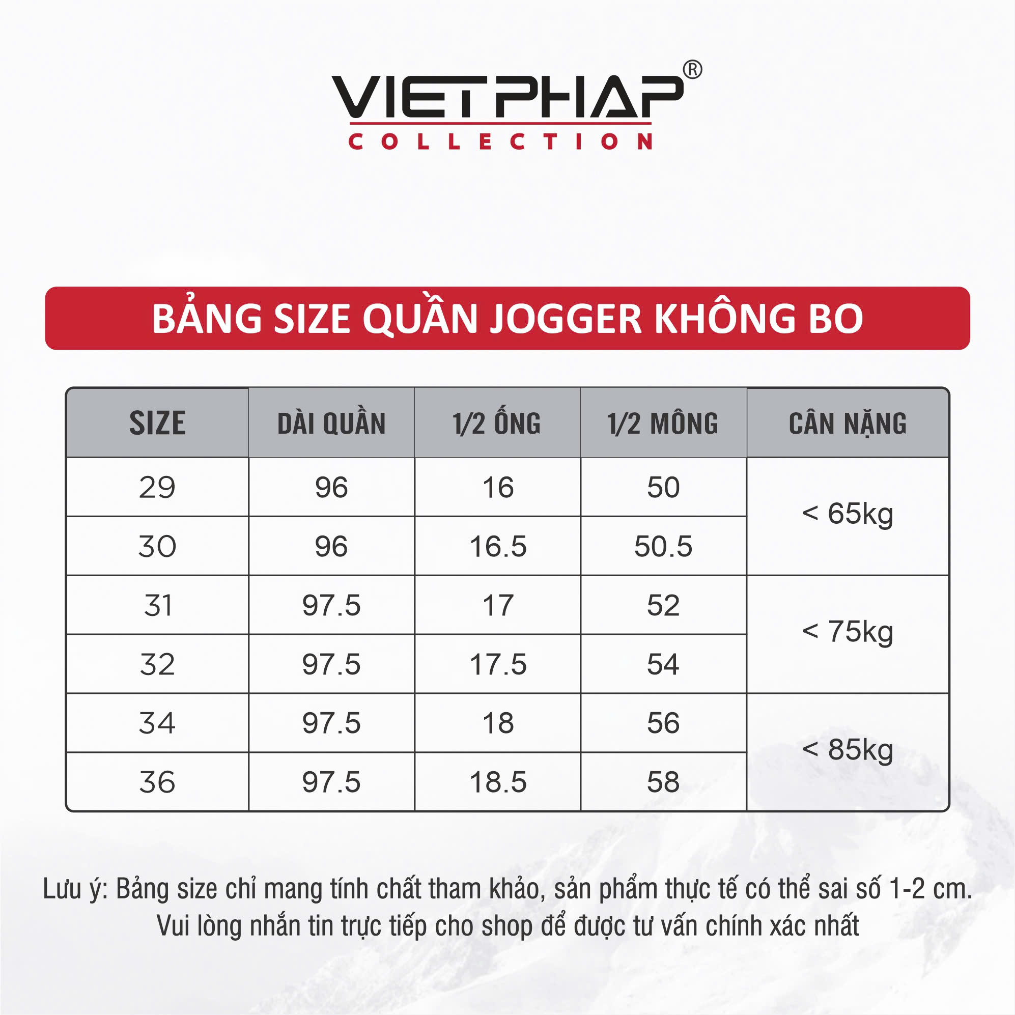 Quần Jogger Không BoVIỆT PHÁP - Chất liệu: Cotton kết hợp với sợi Spandex - Size: 29 - 30 - 31 - 32 - 34 - 36 - Màu: Đen - Kem - Xám Đậm