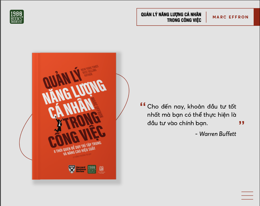 Hiệu suất cao là kết quả của nhiều yếu tố, bao gồm cả mặt tổ chức và cá nhân. Trong đó, điều duy nhất bạn có thể kiểm soát và thay đổi là năng lượng của bản thân: kiên định theo đuổi mục tiêu, tạo sức hút kết nối, tập trung phát triển năng lực hay duy trì thể trạng khỏe mạnh… Cuốn sách “Quản lý năng lượng cá nhân trong công việc” chính là lời giải cho bài toán năng suất với 8 thói quen để duy trì tập trung và nâng cao hiệu suất.