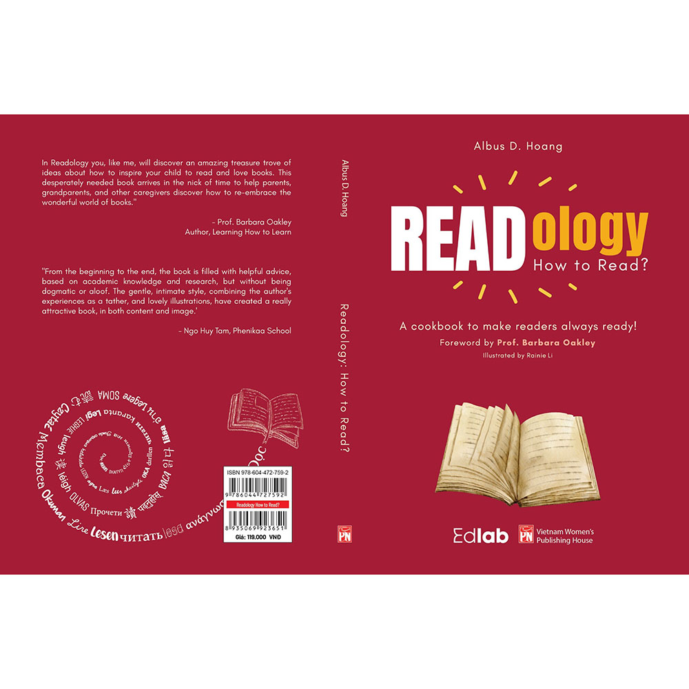 - ISBN: 978-604-472-759-2 - Mã: 8935069923651 Readology: Đọc thế nào? – một hướng dẫn nhỏ để giúp những người đọc sách luôn sẵn sàng! Tác giả Albus D. Hoang (Hoàng Anh Đức) vừa ra mắt phiên bản tiếng Anh của cuốn sách này, với tựa đề Readology: How to read? Bản tiếng Anh được Giáo sư Barbara Oakley viết lời giới thiệu, và trên hết, bà đã cùng cháu của mình đọc sách cũng như thực hành theo cuốn sách một cách đầy hứng khởi! Có ai đó từng nói rằng: “Một đứa trẻ ham đọc rồi sẽ là một người trưởng thành biết suy nghĩ”. Nhưng chúng ta nên hướng dẫn, rèn luyện trẻ đọc thế nào đây? Câu hỏi ấy cứ ở mãi trong đầu Hoàng Anh Đức – một ông bố, đồng thời là nhà giáo dục tâm huyết. Sau vài tháng, cuốn sách Readology: How to read? đã ra đời! Thoạt tiên, chúng ta ngỡ tưởng tác phẩm này thiên về tính học thuật, nhưng khi bắt đầu đọc một trang, rồi trang tiếp theo… lại thấy nội dung “thân thiện”, dễ hiểu với văn phong dí dỏm song không thiếu sự khúc chiết, khoa học. Mở đầu mỗi chương, tác giả mượn lời các danh nhân, học giả như Claude Lesvi-Strauss, D.Vance Smith, Francis Bacon bình luận về sách cũng như việc đọc sách. Từ đó, anh phân tích dưới góc độ cá nhân, tiếp đến là trình bày những trải nghiệm thực tế với trẻ em – cô con gái đáng yêu của mình! “Khi bé Kiwi nhà tôi 2 tuổi, bạn ấy đã không mấy thích thú những loài động vật dưới nước. Cô bé thích khủng long hơn. Trong khi khám phá thế giới khủng long, cô bé đã phát hiện ra ốc anh vũ - ứng viên mà nhiều nhà khoa học tin là thủy tổ của loài mực hiện đại () Toàn bộ tiến trình này không hề được lường trước. Điều mà chúng tôi làm chỉ đơn thuần là lắng nghe cô bé và hỗ trợ con trong suốt quá trình đọc sách. Cuối cùng, khi 3 tuổi, bạn Kiwi cũng đã thiết lập một thói quen mới về việc đọc Bách khoa Hải dương học”. Nhờ vậy, trong Readology: How to read? chúng ta tiếp nhận kiến thức, nhưng không chỉ vậy, chúng ta còn chia sẻ cả tình cảm, cảm xúc nữa: “Bạn có thể nối mạch tinh thần đọc sách của gia đình mình với những cộng đồng đọc sách khác. Có cả tá những loại hoạt động có thể giúp cải thiện các thói quen đọc, cũng như để dạy cho con trẻ về việc chia sẻ và quan tâm – những hạt mầm để nuôi dưỡng tình bạn trong tương lai của con trẻ”. Đó là điều quý giá khiến cuốn sách không gây cảm giác “nhắc lại”, “sao chép”. Kĩ thuật đọc thế nào được Hoàng Anh Đức giới thiệu theo từng cấp độ, chủ yếu xoay quanh đối tượng người-đọc-nhí, dựa trên tinh thần tôn trọng con trẻ, trên nhịp độ khoan thai, nhịp nhàng: đọc sách cùng trẻ sơ sinh và nhũ nhi, đọc sách cùng trẻ ấu nhi, đọc sách với trẻ mẫu giá Bằng kĩ thuật phù hợp, cộng thêm tình cảm, cảm xúc mà chúng ta (và con trẻ, dĩ nhiên!) dành cho những giờ đọc sách, cho không gian đọc sách… thì việc đọc trở thành thói quen, niềm hứng thú hết sức tự nhiên. Không chỉ dừng lại ở đó, tác giả Hoàng Anh Đức còn tiếp tục gợi mở việc kể thế nào, bởi vì đọc và kể dường như luôn song hành, giống như hai khía cạnh nhận và trao: Chúng ta tiếp thu những điều mới mẻ, thú vị, bổ ích dường như là để truyền tỏa các giá trị đó chứ đâu chỉ giữ cho riêng mì