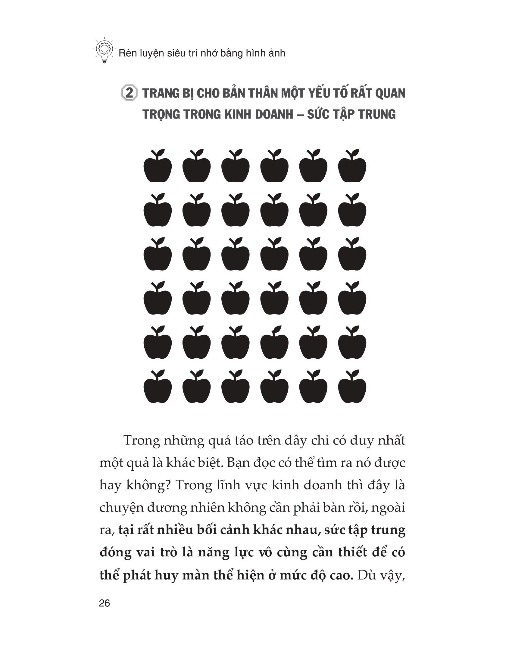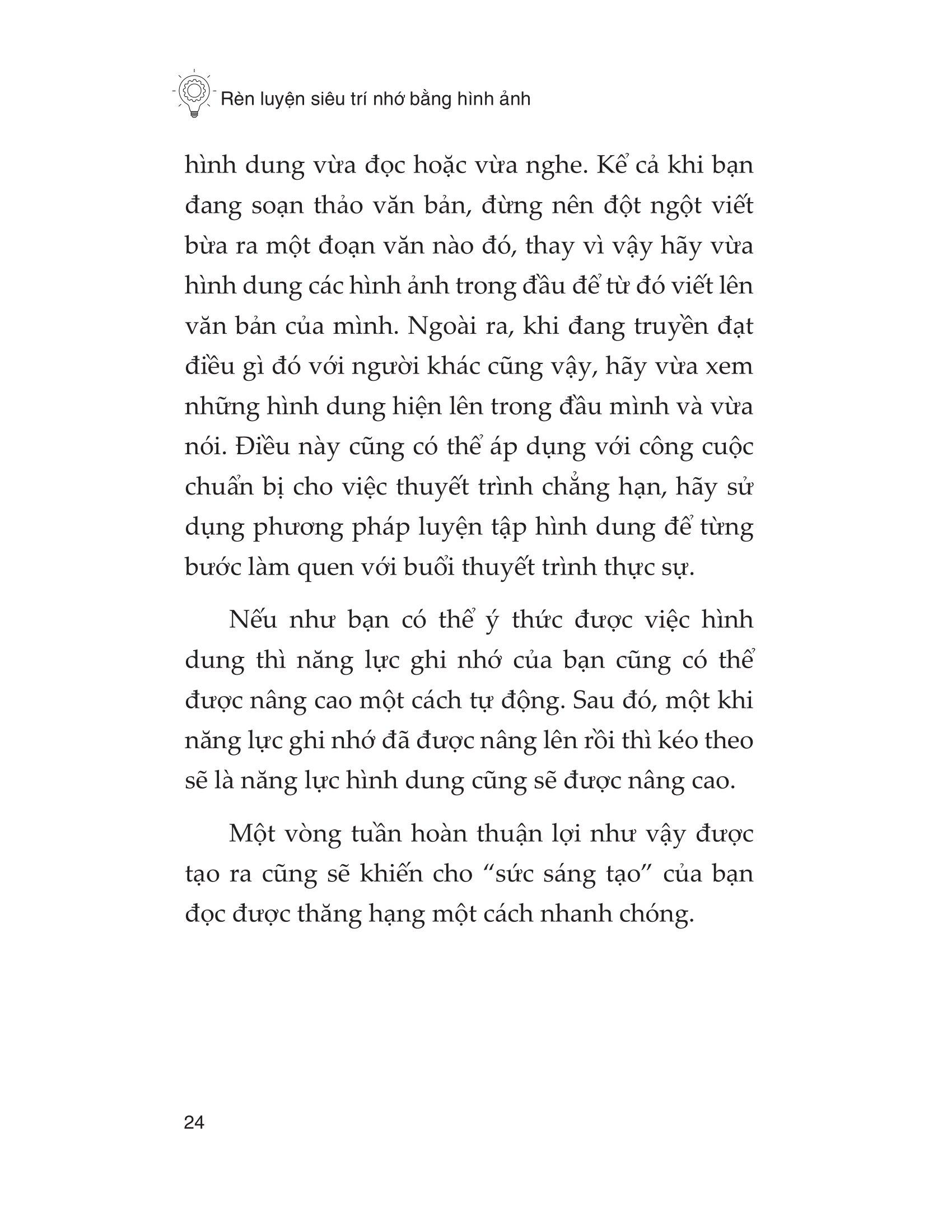 Cuốn sách Rèn luyện siêu trí nhớ bằng hình ảnh sẽ giải thích phương pháp xử lý hình ảnh và các kỹ thuật phân tách, chuyển đổi và liên kết thông tin sao cho dễ nhớ để ai cũng làm được và giúp bạn tối ưu hóa tiềm năng não bộ.