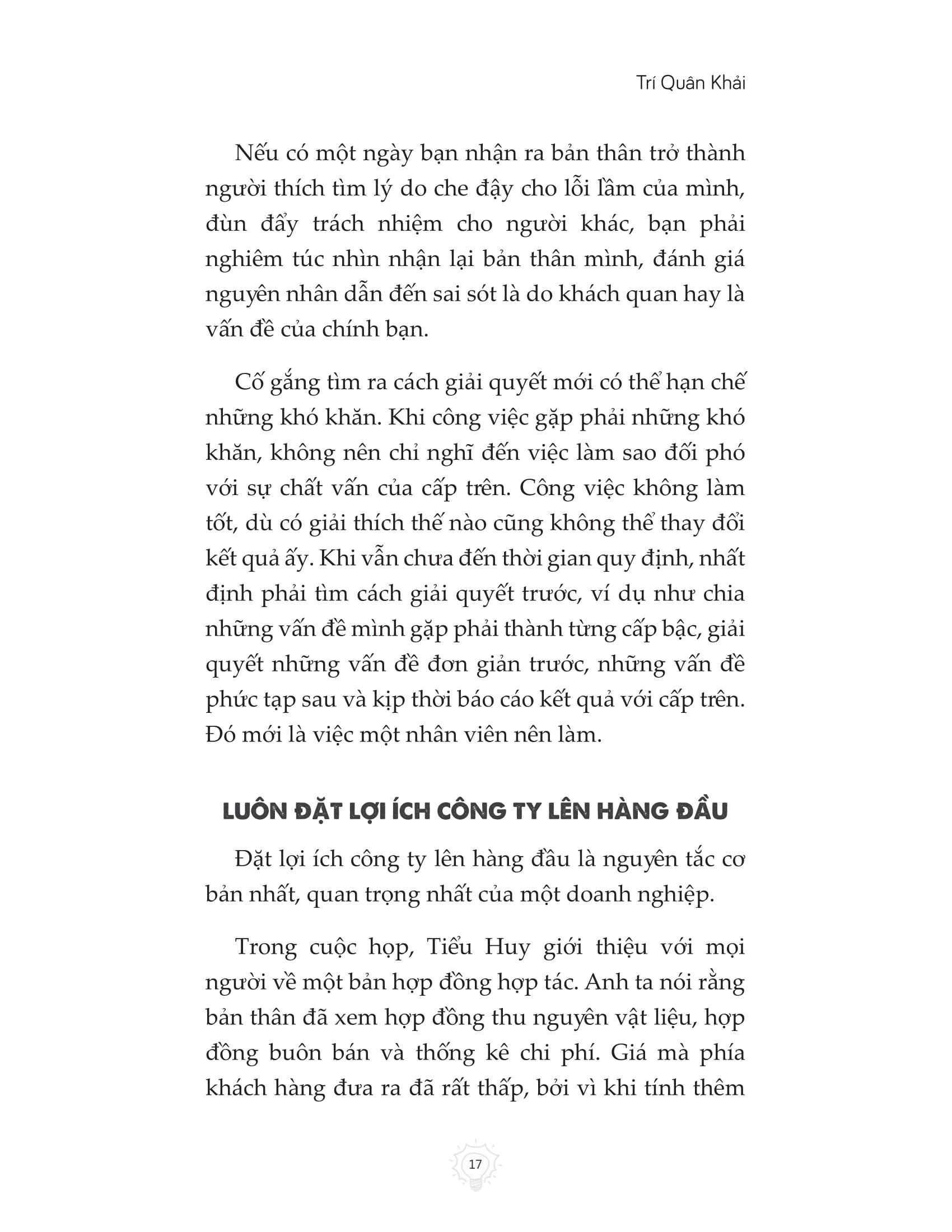 • Tác giả Trí Tuấn Khải Người dẫn chương trình, nhà sản xuất phim, người xây dựng kế hoạch tiếp thị, chuyên gia đào tạo lập kế hoạch nghề nghiệp. Sở hữu tài khoản Tiktok “智哥大叔” (Tạm dịch: Chú Trí Ca) với hơn hai triệu người theo dõi; được gọi là “Anh cả nơi làm việc trên TikTok, tài khoản trên MCN có hơn mười triệu người theo dõi. Hiện đang là CEO của một công ty thương mại. Là một doanh nhân khởi nghiệp và là một người lãnh đạo có kinh nghiệm; là tác giả của rất nhiều cuốn sách phong phú về nội dung, tư duy rõ ràng, trực tiếp hướng dẫn bạn cách trở thành người đáng tin, làm việc theo tư duy khép kín.