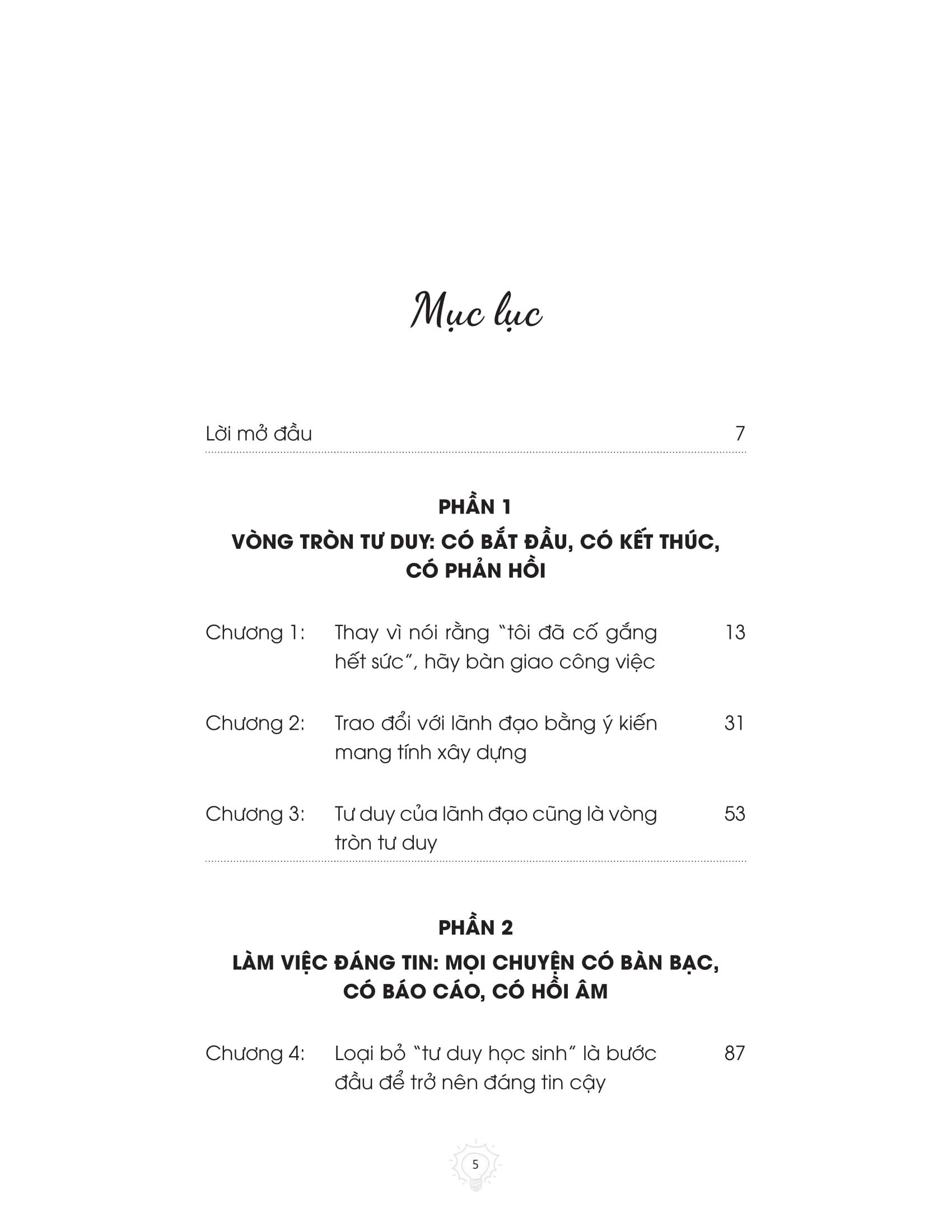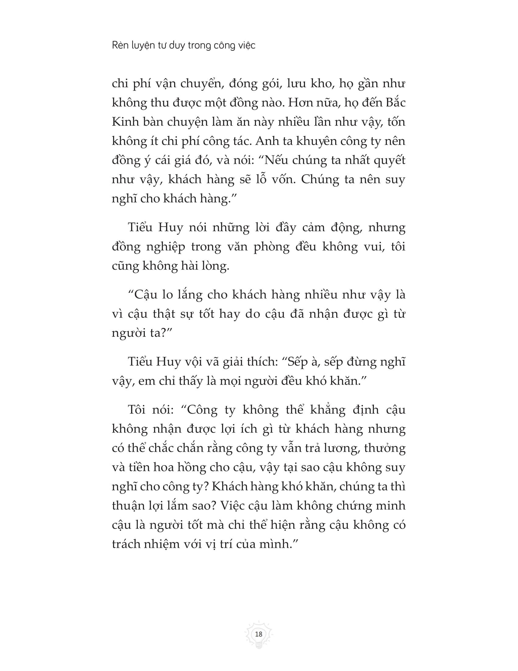 Kỹ năng tư duy giúp con người đưa ra những quyết định và hành động đúng đắn hơn trong công việc và cuộc sống. Thế nhưng, không phải ai sinh ra cũng đã có kỹ năng tư duy. Để có thể vận dụng tư duy, trí tuệ, bạn cần phải được bồi dưỡng và rèn luyện không ngừng. Mọi người đều tự cho rằng mình là giỏi nhất, năng lực của mình tốt nhất, xứng đáng có một vị trí công việc tốt hơn, một thu nhập cao hơn. Nhưng khi đánh giá cao bản thân mình, con người thường lầm tưởng về năng lực làm việc và năng lực tư duy của chính mình. Phải hiểu rõ, thành công trong đời người không chỉ dừng lại ở việc tìm được công việc tốt, mà phải là việc khai thác được những cơ hội tốt hơn từ trong chính công việc và biết cách bồi dưỡng, rèn luyện tư duy bản thân trẻ nên ưu tú. “Thành công lớn hơn trong sự nghiệp đến từ sự tích cực suy nghĩ và hành động.” Khi tìm kiếm những cơ hội trong công việc, bạn cần phải tránh lối tư duy bị động giống như một người làm thuê. Bạn nên suy nghĩ xem làm thế nào để các khâu trong công việc đều tiến hành thuận lợi, không để cấp trên phải đôn đốc thực hiện. Chỉ có tư duy chủ động mới có thể khiến bạn ngày càng chủ động trong công việc, ngày càng nhận được sự tín nhiệm từ cấp trên và khách hàng. Chúng ta học hỏi và hiểu về vòng tròn tư duy, đồng thời vận dụng vào công tác quản lý đội nhóm và đào tạo nhân viên với mục tiêu giúp đội nhóm của chúng ta ngày càng đáng tin hơn, chứ không phải ngày càng không theo chuẩn mực. Bạn là một nhà quản lý, có thể tạm thời bạn phải bỏ ra rất nhiều điều khi làm việc đáng tin, nhưng bạn sẽ thấy mình nhận lại được sự đền đáp lớn hơn bội phần khi nhìn lại chặng đường đã qua. Bạn cũng có thể đánh giá nhân viên, đối tác của mình bằng vòng tròn tư duy, giúp bản thân loại bỏ những người không đáng tin. Cuối cùng, bạn sẽ thấy tinh thần làm việc của các thành viên trong đội nhóm thay đổi, họ coi trọng thực thi và hiệu suất. Điều này có thể khiến việc quản lý của bạn trở nên nhẹ nhàng hơn, hoàn thành được hiệu quả. “Rèn luyện tư duy trong công việc” sẽ giúp bạn đánh thức năng lực tư duy của bản thân, từ đó nâng cao hiệu suất và chất lượng làm việc. Bằng cách rèn luyện phương pháp giải quyết vấn đề thông minh và nuôi dưỡng các mối quan hệ một cách hợp lý, tất cả chúng ta đều có thể nâng tầm bản thân trong mọi lĩnh vực cuộc sống.