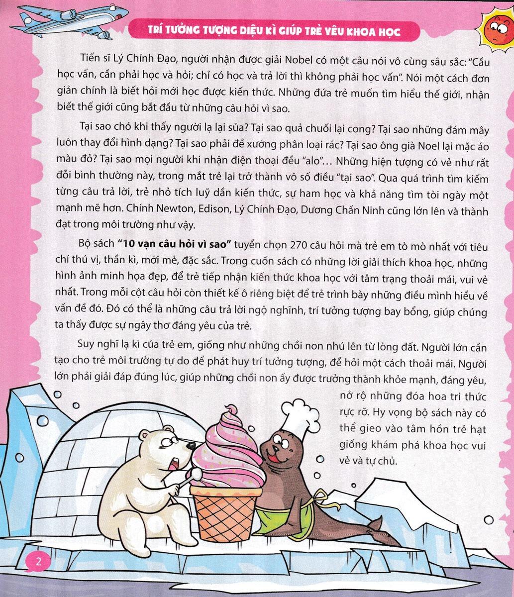Bộ sách “10 vạn câu hỏi vì sao" tuyển chọn 270 câu hỏi mà trẻ em tò mò nhất với tiêu chí thú vị, thần kì, mới mẻ, đặc sắc. Trong cuốn sách có những lời giải thích khoa học, những hình ảnh minh họa đẹp, để trẻ tiếp nhận kiến thức khoa học với tâm trạng thoải mái, vui vẻ nhất. Trong mỗi cột câu hỏi còn thiết kế ở riêng biệt để trẻ trình bày những điều m.ình hiểu về vấn đề đó. Đó có thể là những câu trả lời ngộ nghĩnh, trí tưởng tượng bay bổng, giúp chúng ta thấy được sự ngây thơ đáng yêu của trẻ.