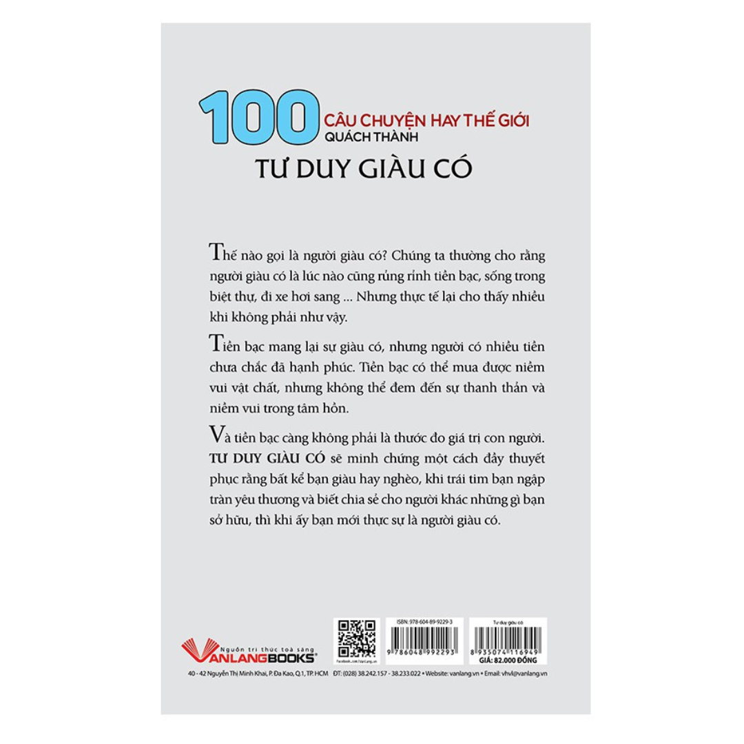 Thế nào gọi là người giàu có? Chúng ta thường cho rằng người giàu có là lúc nào cũng rủng rỉnh tiền bạc, sống trong biệt thự, đi xe hơi sang Nhưng thực tế lại cho thấy nhiều khi không phải như vậy. Tiền bạc mang lại sự giàu có, nhưng người có nhiều tiền chưa chắc đã hạnh phúc. Tiền bạc có thể mua được niềm vui vật chất, nhưng không thể đem đến sự thanh thản và niềm vui trong tâm hồn, và tiền bạc càng không phải là thước đo giá trị con người. TƯ DUY GIÀU CÓ sẽ minh chứng một cách đầy thuyết phục rằng bất kể bạn giàu hay nghèo, khi trái tim bạn ngập tràn yêu thương và biết chia sẻ cho người khác những gì bạn sở hữu, thì khi ấy bạn mới thực sự là người giàu có.