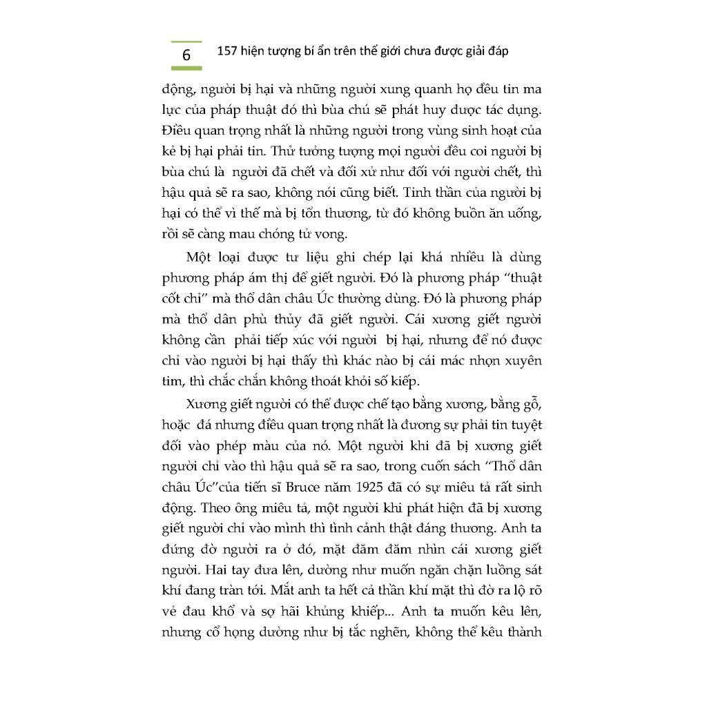 157 hiện tượng bí ẩn trên thế giới chưa được giải đáp (tái bản bìa mềm) Đây là cuốn sách tìm hiểu các hiện tượng trên thế giới bao gồm: I. Bí mật về thần chú và phép phù thủy II. Bí mật về giấc mộng và đoán mộng III. Những tiên đoán bí ẩn IV. Bí mật về hiện tượng trùng hợp huyền bí V. Bí mật về hồn ma và hồn ma bám theo người VI. Bí mật của thuật chiêm tinh VII. Những hiện tượng mất tích bí ẩn VIII. Khả năng kỳ lạ ở con người IX. Bí mật về những động vật kỳ dị X. Hiện tượng người rừng thần bí