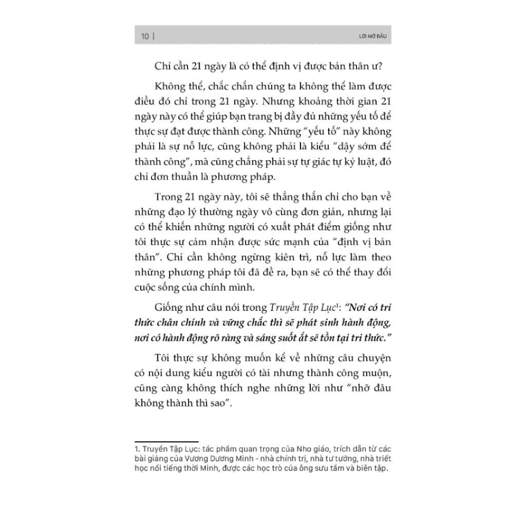Trong cuốn sách này, Lữ Bạch chia sẻ cách nhanh chóng thực hiện các thay đổi và phát triển hiệu quả trong 21 ngày. Từ chối những nỗ lực và tưởng tượng sai lầm, chỉ cần làm và thực hiện nó. Nó được viết cho những người bình thường như anh ấy, những người không có nền tảng trường lớp danh giá nhưng muốn thay đổi vận mệnh của mình thông qua sự chăm chỉ.