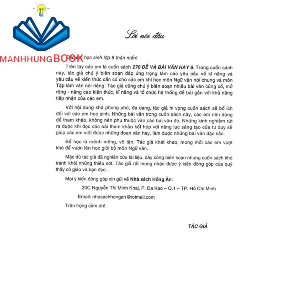 Trên tay các em là cuốn sách 270 Đề Và Bài Văn Hay Lớp 6. Trong cuốn sách này, tác giả chú ý biên soạn đáp ứng trọng tâm các yêu cầu về kĩ năng và yêu cầu về kiến thức cần có cho các em khi học môn Ngữ văn nói chung và môn Tập làm văn nói riêng.