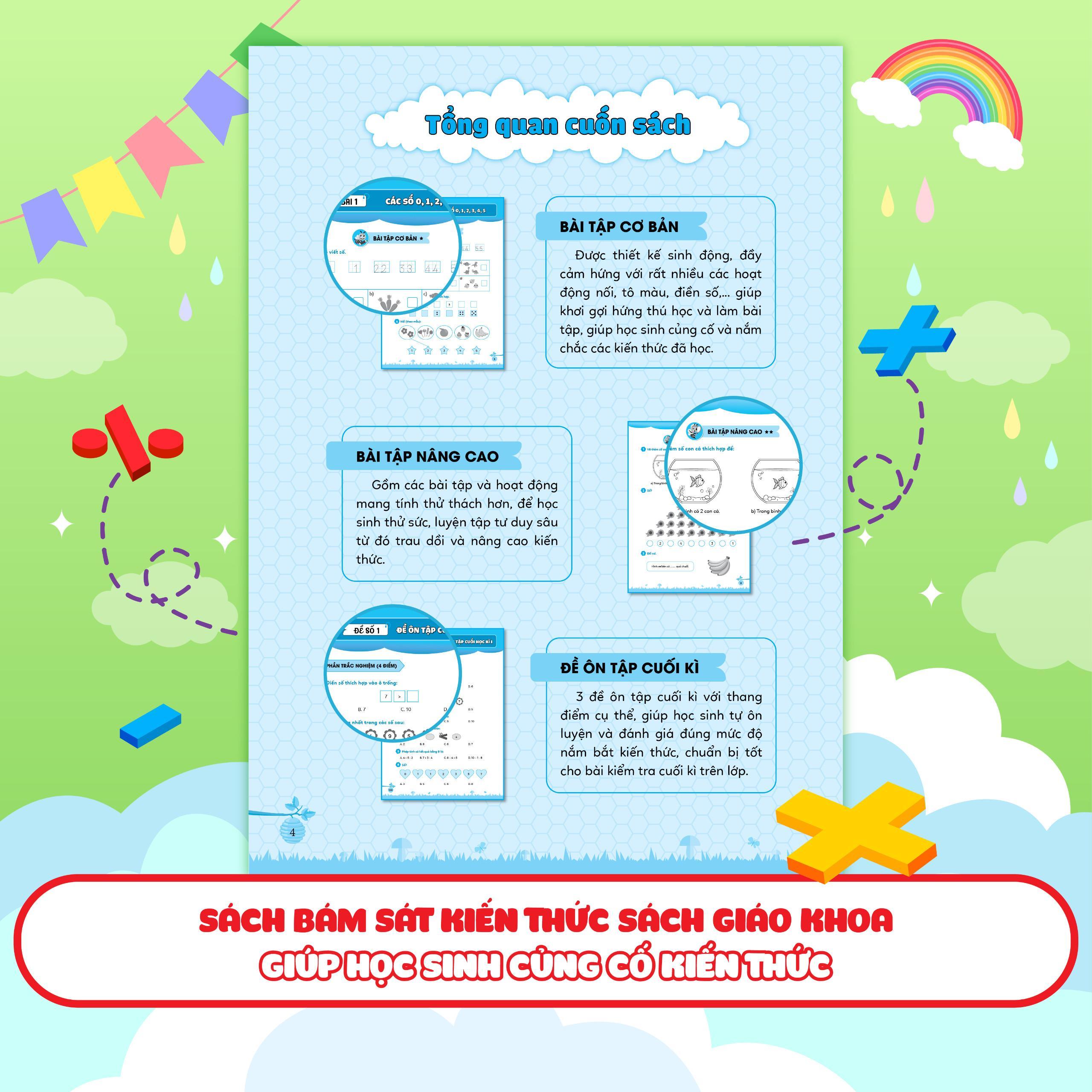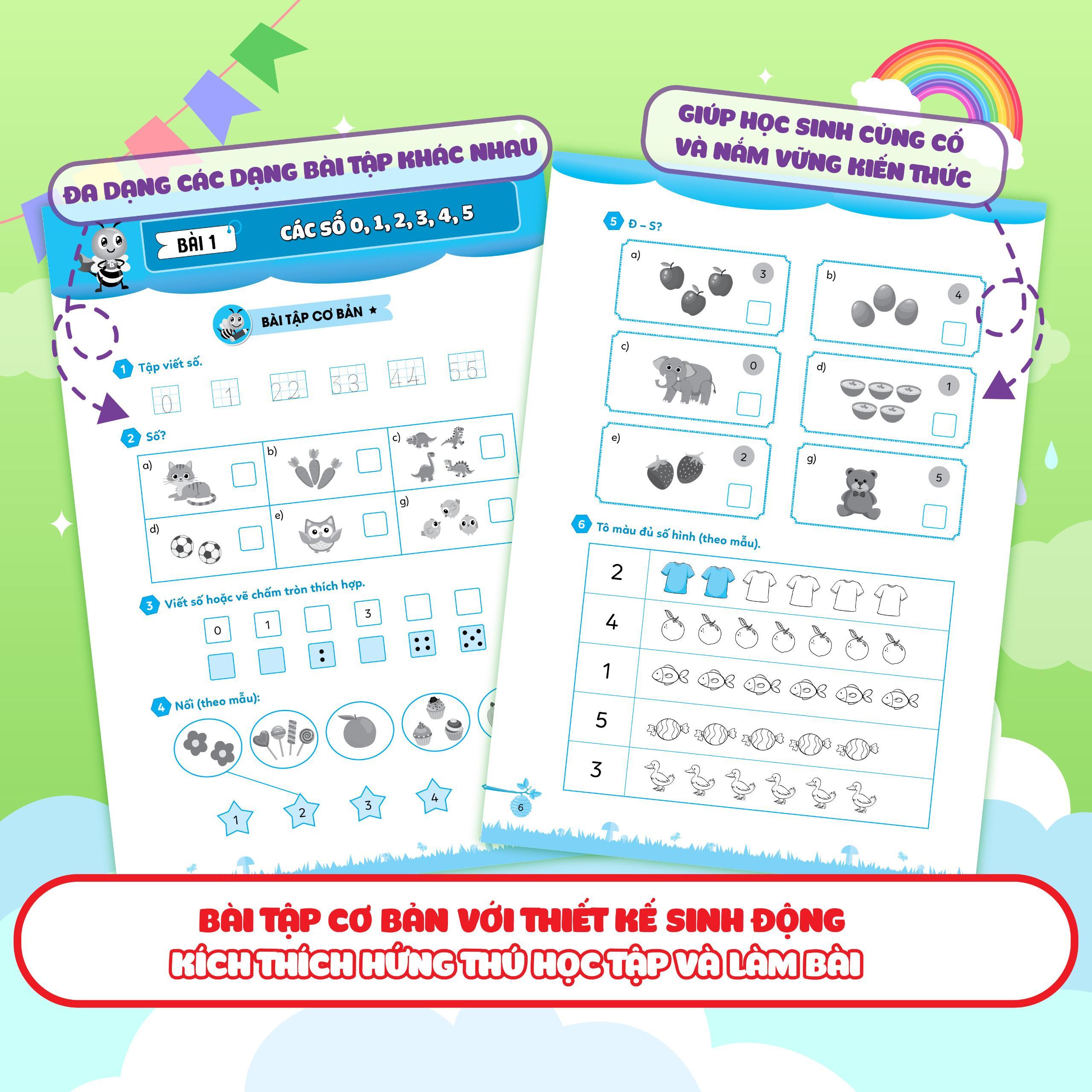 - Bài tập cơ bản Các bài tập trong phần này được thiết kế sinh động, đầy cảm hứng với rất nhiều các hoạt động nối, tô màu, điền số,... giúp khơi gợi hứng thú học và làm bài tập của các em, đồng thời giúp các em củng cố và nắm chắc các kiến thức đã học.