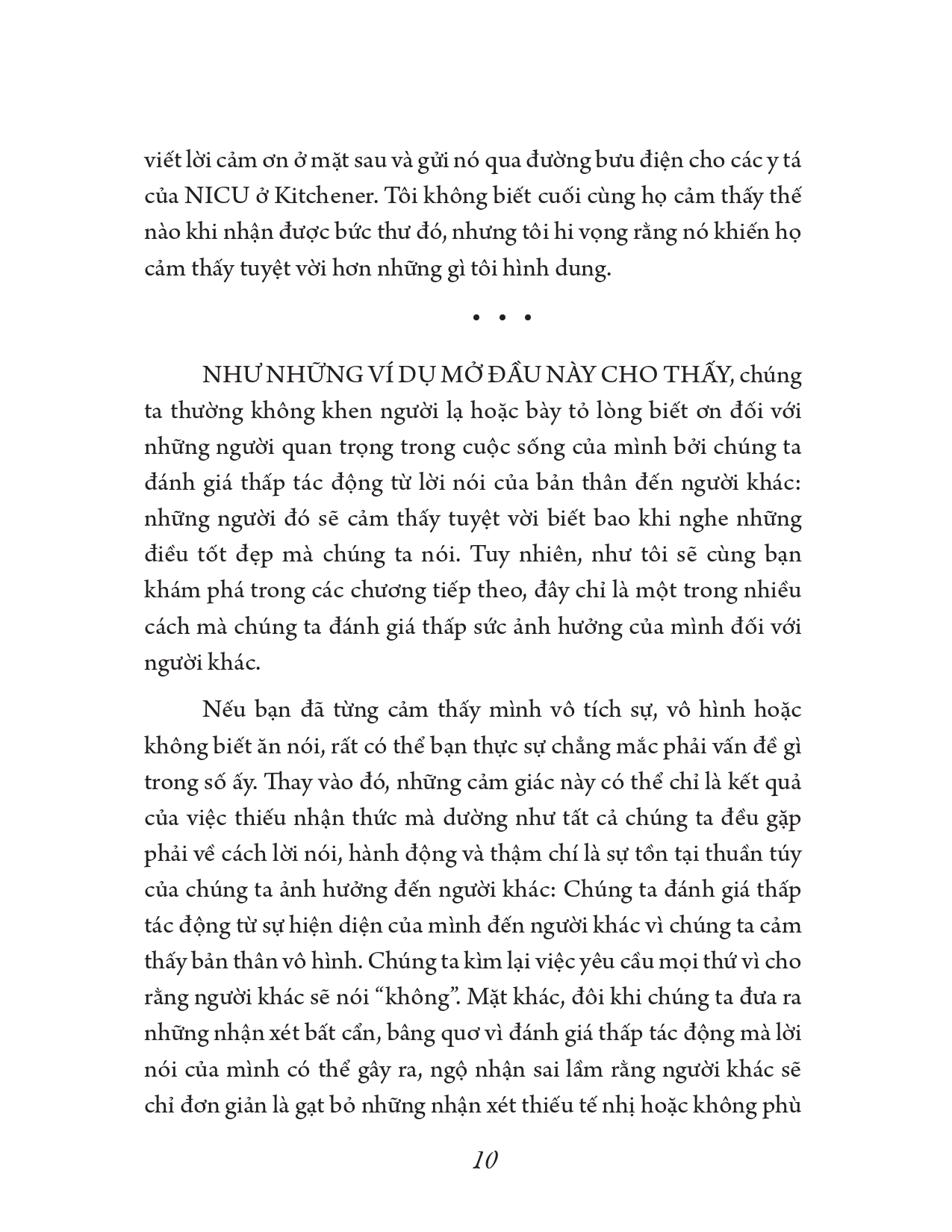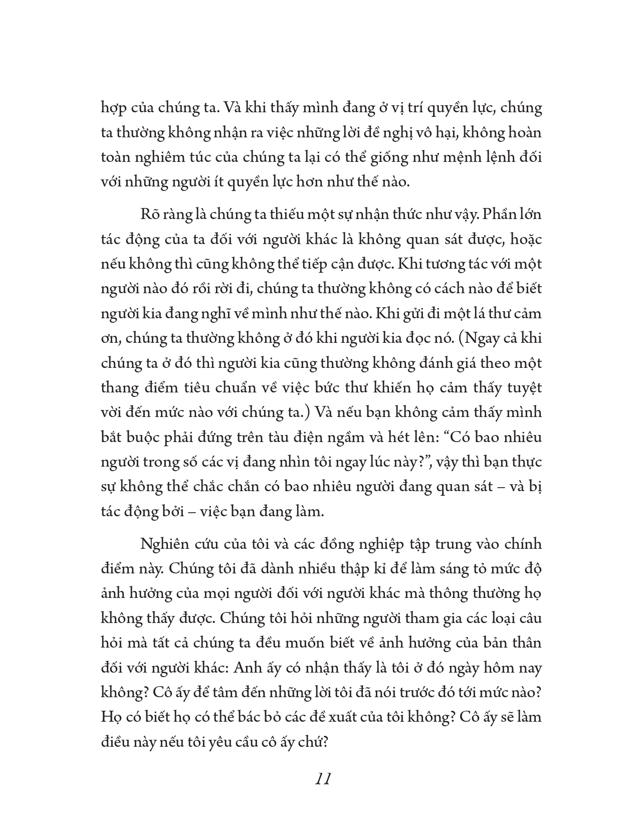 ầu hết chúng ta thường không có được hiểu biết sâu sắc về cách chúng ta ảnh hưởng đến người khác. Cho dù chúng ta tác động đến người khác theo những cách lớn lao, mang tính thay đổi cuộc đời, hay theo những cách nhỏ hơn, diễn ra hằng ngày, chúng ta thường chỉ hiểu thấu được một phần rất nhỏ về tác động thực sự của mình. Và bởi chúng ta hiếm khi có được hiểu biết sâu sắc về ảnh hưởng của bản thân đối với người khác nên có thể chúng ta đã thường xuyên đánh giá thấp mức độ ảnh hưởng của mình.