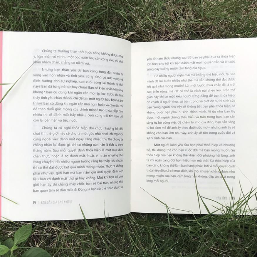 - Bạn Đắt Giá Bao Nhiêu? Câu trả lời này do chính bạn quyết định, chính bạn “định giá”. Đọc cuốn sách này, đôi khi bạn nên dừng lại và thành thực với bản thân, liệu bạn có đang là phiên-bản-mà-bạn-yêu-thích-nhất, phiên-bản-bạn-mong- muốn-trở-thành. Hãy thử trả lời các câu hỏi: Sự thỏa hiệp có làm bạn hạnh phúc hay không? Bạn có đang cố gắng lấy lòng tất cả mọi người? Bạn có dám thay đổi? Và quan trọng nhất: Bạn đắt giá bao nhiêu?