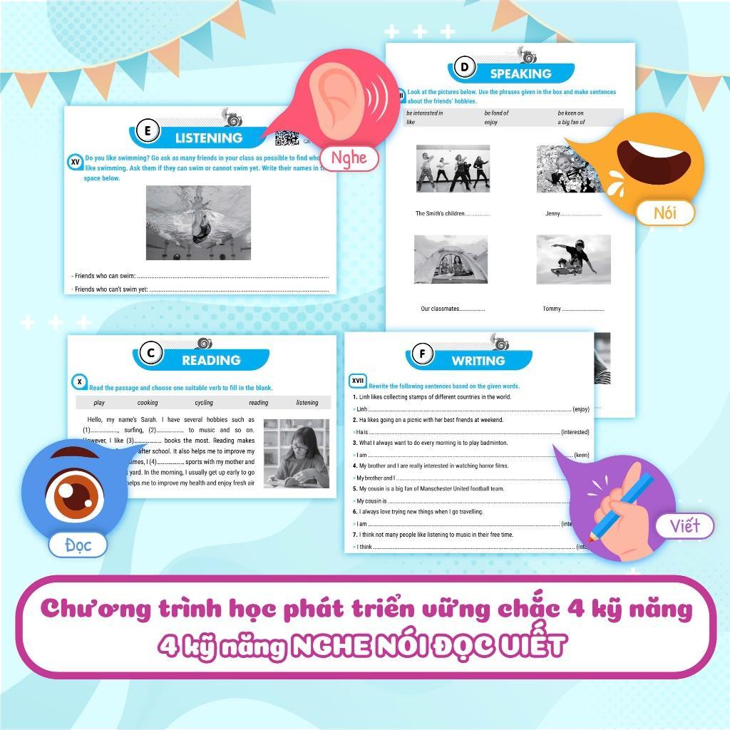 - Bài tập rèn luyện đa dạng, cơ bản và nâng cao Bài tập được phân chia theo 2 cấp độ, cơ bản và nâng cao. Hệ thống bài tập luyện 4 kỹ năng cơ bản giúp các em ôn tập kiến thức trên lớp; bài tập mở rộng, nâng cao để các em rèn luyện và làm quen với các kì kiểm tra, đánh giá. Các bài tập về 4 kỹ năng được liên kết với nhau theo logic bài học giúp cảm em cảm thấy tự tin và phát triển toàn diện kỹ năng nghe, nói, đọc, viết tiếng Anh