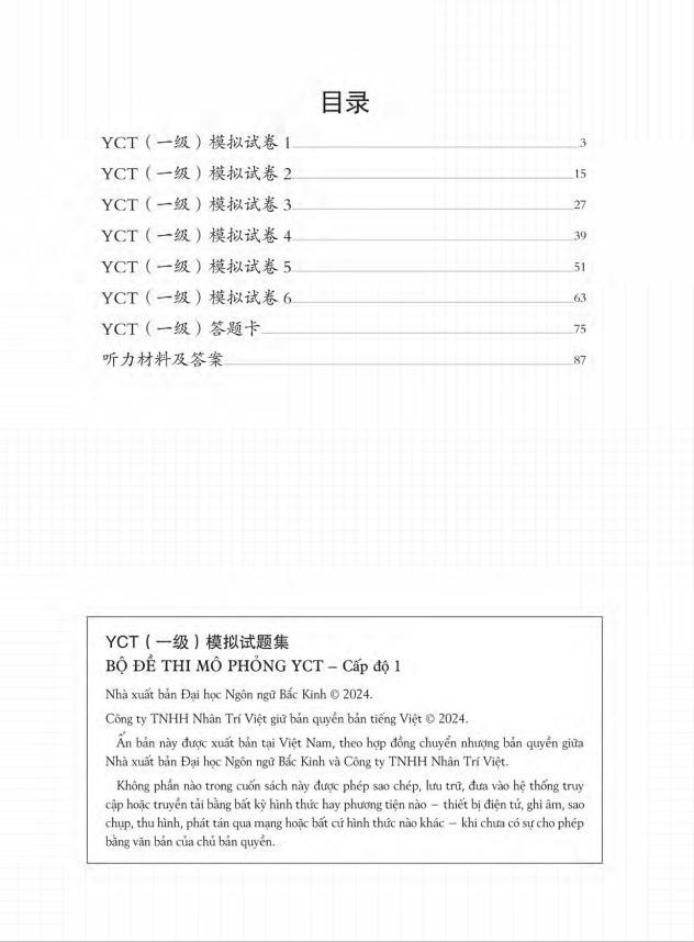 Bộ Đề Thi Mô Phỏng YCT Kỳ thi tiếng Trung dành cho học sinh (Youth Chinese Test – YCT) là kỳ thi chuẩn ở phạm vi quốc tế nhằm đánh giá khả năng sử dụng tiếng Trung trong cuộc sống hằng ngày cũng như trong học tập của học sinh tiểu học và trung học cơ sở có tiếng mẹ đẻ không phải là tiếng Trung. Bộ đề thi mô phỏng YCT gồm bốn quyển (tương ứng với các cấp độ từ 1 đến 4 của kỳ thi YCT), được biên soạn trên cơ sở bám sát những câu hỏi trong các đề thi YCT gần đây nhằm giúp học sinh ôn thi hiệu quả cũng như tự đánh giá trình độ của bản thân.