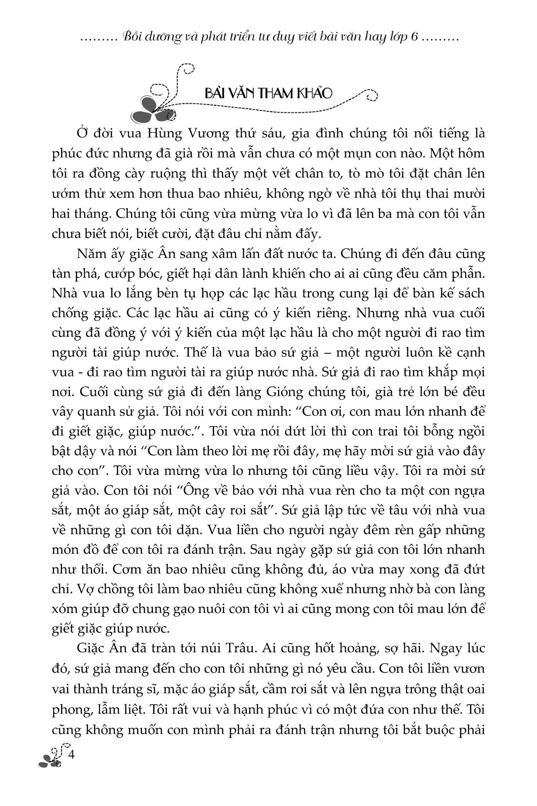 - Năm xuất bản : 2024 GIỚI THIỆU SÁCH Chương trình SGK mới rất chú trọng đến việc phát triển năng lực, phẩm chất của học sinh. Trong đó, kỹ năng Viết là một trong những nội dung học tập rất quan trọng. Để đáp ứng nhu cầu học tập, rèn luyện và nâng cao kỹ năng này, chúng tôi biên soạn cuốn sách: BỒI DƯỠNG VÀ PHÁT TRIỂN TƯ DUY VIẾT BÀI VĂN HAY LỚP 6 (Dùng chung cho 3 bộ SGK theo chương trình mới) Cuốn sách bám sát theo chương trình đổi mới của Bộ Giáo dục và Đào tạo. Các đề văn được biên soạn sao cho gần gũi, dễ hiểu, dễ thực hành cho học sinh. Đồng thời, dưới mỗi đề bài đều có phần hướng dẫn, gợi ý cùng đoạn văn, bài văn tham khảo. Tin chắc rằng, với cấu trúc như trên, cuốn sách sẽ là người bạn tri thức đáng tin cậy đối với các em. Nhân dịp cuốn sách được phát hành, chúng tôi xin được gửi lời cảm ơn chân thành nhất đến quý tác giả các tài liệu, hình ảnh, trích dẫn; các trang báo điện tử,... đã được chúng tôi tuyển chọn, chắt lọc và đưa vào sách nhằm tăng thêm tính hấp dẫn, thú vị, bổ ích. Hi vọng rằng quyển sách sẽ là tài liệu hữu ích trên bước đường chinh phục tri thức của các em học sinh. Đồng thời đây cũng là tài liệu tham khảo thiết thực dành cho giáo viên, phụ huynh trong việc giúp cho con em mình thực hiện tốt hơn kỹ năng VIẾT trong chương trình SGK mới. Dẫu rằng, chúng tôi đã rất cẩn trọng trong quá trình biên soạn nhưng thiếu sót là điều khó tránh khỏi. Rất mong nhận được nhiều ý kiến đóng góp quý báu từ quý độc giả xa gần để sách ngày càng được hoàn thiện hơn
