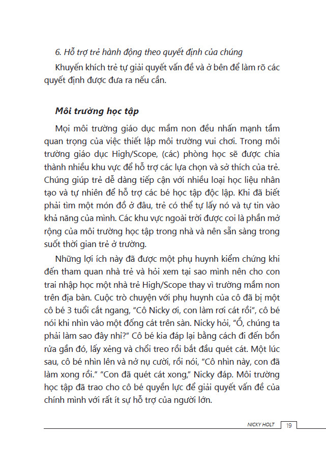 Nicky Holt là chuyên gia trong lĩnh vực giáo dục giai đoạn đầu đời tại Vương quốc Anh. Tác giả đã có 14 năm khai thác, triển khai và phát triển cách tiếp cận High/Scope với tư cách một nhà tư vấn và đào tạo cho các cơ sở giáo dục mầm non địa phương.