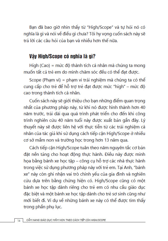 Cẩm nang giáo dục mầm non theo phương pháp High/Scope sẽ cung cấp phần giới thiệu về triết lý giáo dục High/Scope và cách nó được sử dụng trong những năm đầu đời của trẻ. Cuốn sách sẽ giới thiệu những điểm quan trọng nhất của phương pháp này, từ khi nó được hình thành hơn 40 năm trước cho đến khi được xuất bản gần đây. Lý thuyết này sẽ được liên hệ với thực tiễn từ các trải nghiệm cá nhân của tác giả khi sử dụng phương pháp High/Scope ở nhiều cơ sở mầm non và trường học trong hơn 13 năm qua.