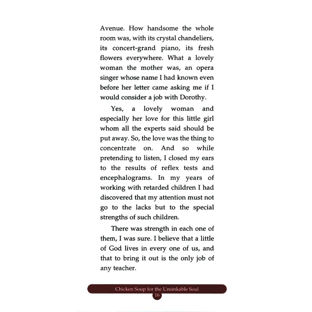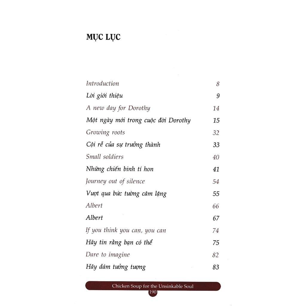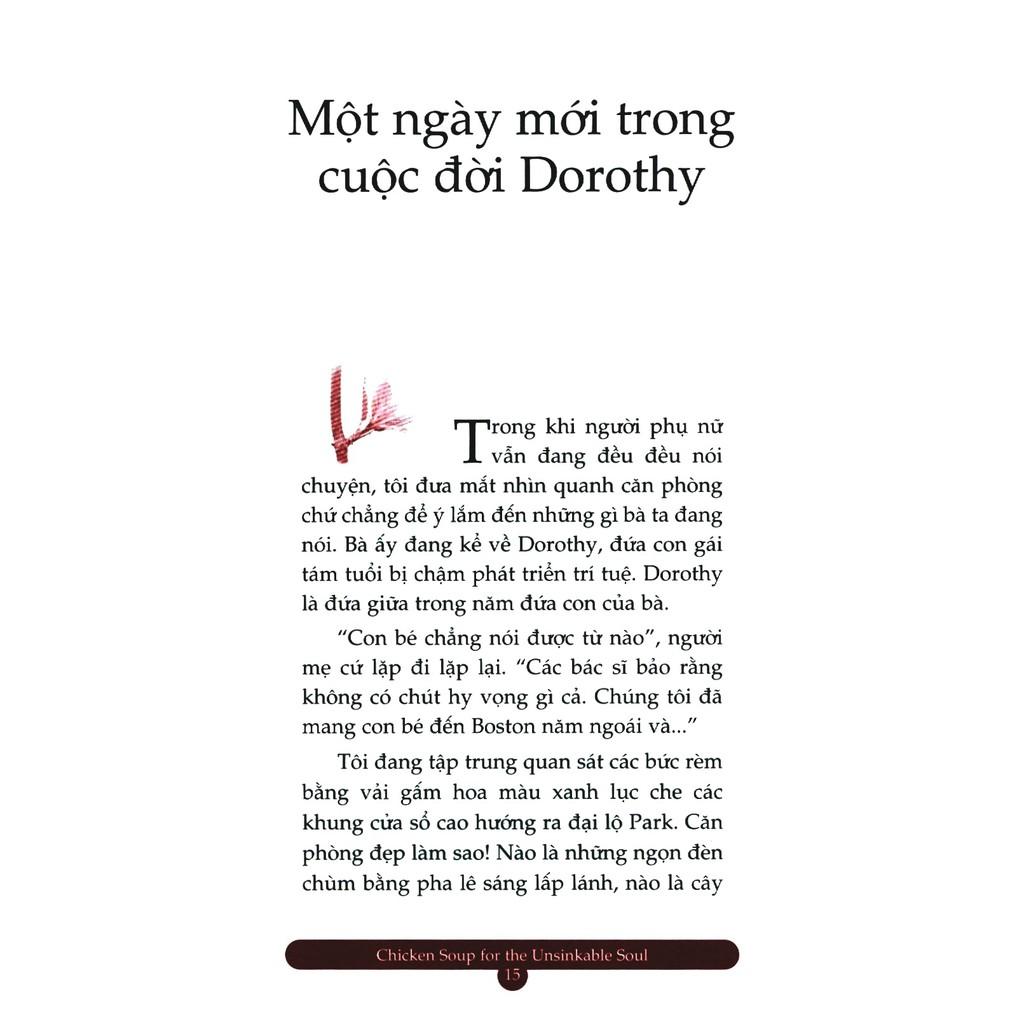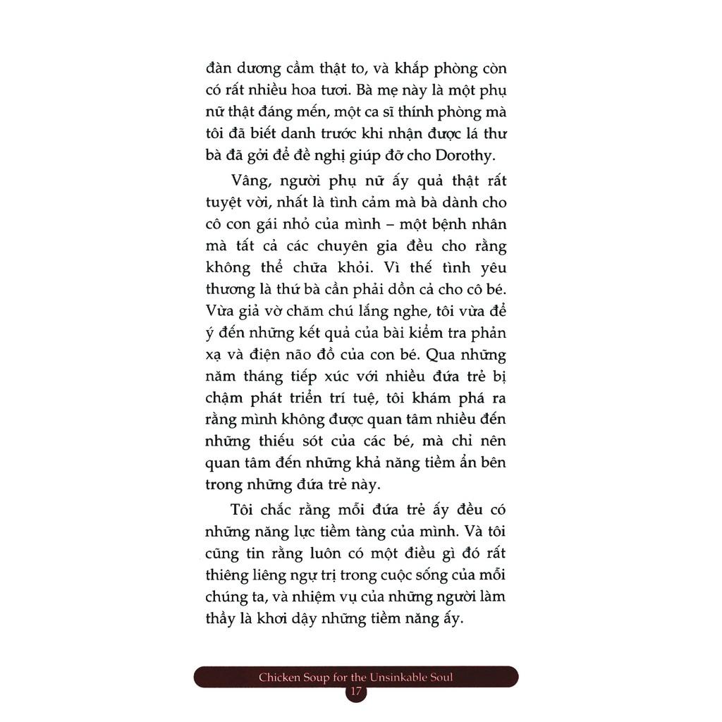 Tiếp đến, Chicken Soup for the Unsinkable Soul cũng sẽ giúp bạn nhận ra giá trị đích thực của những tấm lòng biết sẻ chia. Chúng tôi hy vọng những mẩu chuyện nhỏ ấy sẽ khuyến khích bạn tìm đến mọi người khi bạn cần được giúp đỡ cũng như giúp bạn sẽ mở rộng trái tim mình với những ai đang cần tựa đầu vào bờ vai bạn. Và cuối cùng, có rất nhiều mẩu chuyện sẽ chứng minh cho chúng ta thấy rằng trở ngại cũng chính là người thầy tốt nhất của mỗi người. Chúng có thể khơi dậy sức mạnh tiềm tàng của ta, nhắc chúng ta nhớ về những khía cạnh cần hoàn thiện, chỉ dẫn chúng ta cách giữ vững lòng tin vào chính mình và hướng dẫn ta cách chấp nhận những việc không thuộc phạm vi kiểm soát của bản thân.