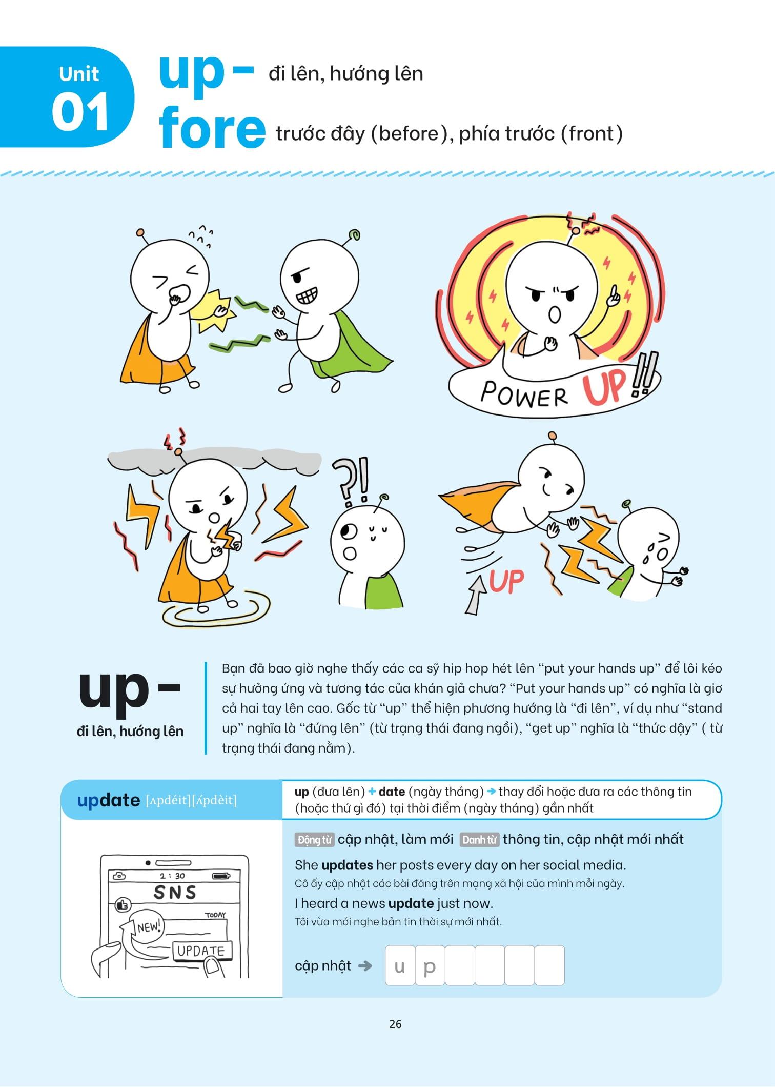 - Minh họa bằng hình ảnh sinh động, trực quan: Các gốc từ được diễn họa bằng tranh minh họa thú vị, giúp kích hoạt trí tưởng tượng, phù hợp với người học thích phương pháp học qua thị giác.