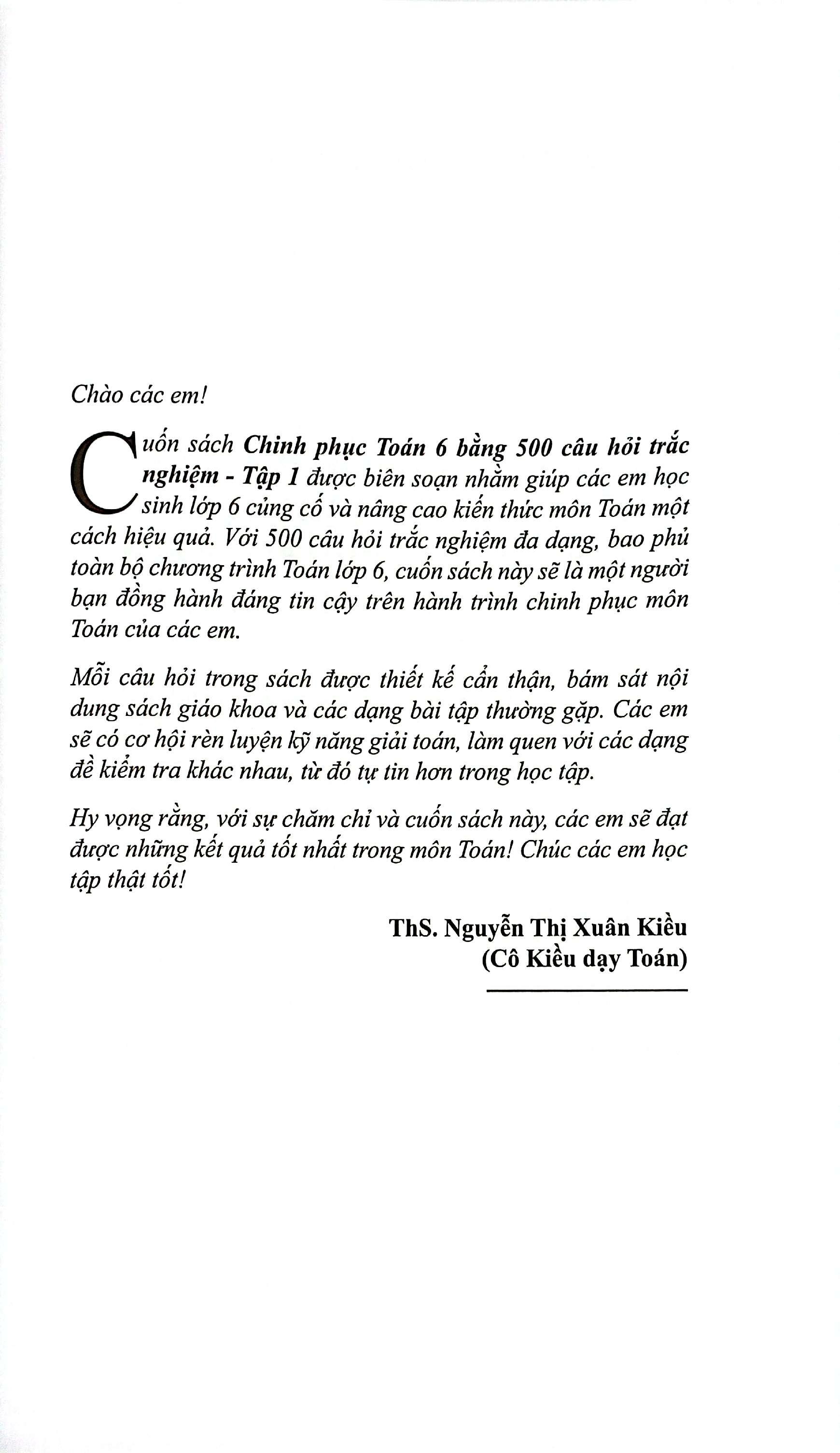 Chinh Phục Toán 6 Bằng 500 Câu Hỏi Trắc Nghiệm - Tập 1 Chào các em! Cuốn sách Chinh phục Toán 6 bằng 500 câu hỏi trắc nghiệm - Tập 1 được biên soạn nhằm giúp các em học sinh lớp 6 củng cố và nâng cao kiến thức môn Toán một cách hiệu quả. Với 500 câu hỏi trắc nghiệm đa dạng, bao phủ toàn bộ chương trình Toán lớp 6, cuốn sách này sẽ là một người bạn đồng hành đáng tin cậy trên hành trình chinh phục môn Toán của các em. Mỗi câu hỏi trong sách được thiết kế cẩn thận, bám sát nội dung sách giáo khoa và các dạng bài tập thường gặp. Các em sẽ có cơ hội rèn luyện kỹ năng giải toán, làm quen với các dạng đề kiểm tra khác nhau, từ đó tự tin hơn trong học tập. Hy vọng rằng, với sự chăm chỉ và cuốn sách này, các em sẽ đạt được những kết quả tốt nhất trong môn Toán! Chúc các em học tập thật tốt!