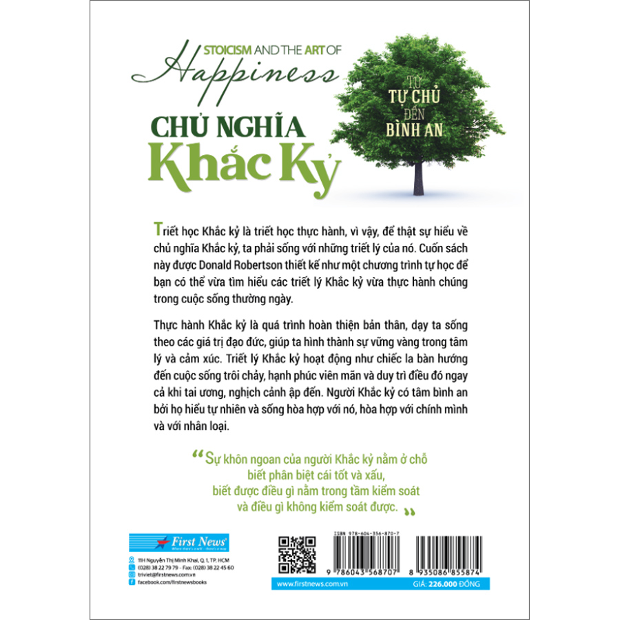 - Hiểu đúng về đức hạnh của người Khắc kỷ - “Tại sao bạn phải lấy làm ngạc nhiên với việc những người tốt đẹp phải trải qua thử thách mới có thể trở nên mạnh mẽ? Không một cái cây nào có thể bám rễ sâu và cứng cáp trừ phi nó bị gió quăng mưa quật. Bởi càng bị quăng quật, rễ cây càng ăn sâu bám chắc. Những cái cây yếu ớt là những cái cây lớn lên trong thung lũng yên bình ngập nắng” - (triết gia cổ đại Seneca). Xoay quanh một trường phái có nhiều biến thể, nhiều hiểu lầm, “Chủ nghĩa Khắc kỷ” của Donald Robertson là một nỗ lực để độc giả có bức tranh toàn cảnh về chủ nghĩa Khắc kỷ, hiểu đúng những tinh hoa của trường phái triết học này để áp dụng vào đời sống. Người Khắc kỷ xem mục tiêu cơ bản của cuộc đời là “sống hòa hợp với tự nhiên”. Một mặt, đó là nỗ lực sống thuận theo bản chất người của chính mình, nói như người Khắc kỷ, là nỗ lực nuôi dưỡng “đức hạnh”. Mà con người vốn là sinh vật có lý trí và có tính xã hội, đồng thời nhiều ham muốn và sợ hãi, nên các đức hạnh quan trọng nhất của chúng ta là khôn ngoan, chừng mực, công bằng, kỷ luật tự giác và can đảm. Nói theo hình ảnh ẩn dụ của Seneca, người càng đức hạnh thì càng giống như cây có rễ sâu, bám chắc vào lòng đất. Mặt khác, thuận theo tự nhiên cũng có nghĩa là chấp nhận vị thế của mình như một phần của toàn thể, của vũ trụ, biết bình thản đón nhận những “gió quăng mưa quật” của số phận. Thuận theo bản thân và toàn thể - hai nhiệm vụ này thực chất bổ sung cho nhau, vì con người cần có đức hạnh để có thể đón nhận bất cứ điều gì cuộc sống mang lại. Người Khắc kỷ tin rằng đức hạnh là thứ duy nhất thật sự tốt đẹp, là điều kiện cần và đủ cho một cuộc sống tốt, còn những thứ “ngoại tại” như sức khoẻ, của cải, danh vọng… là “không quan trọng” và nằm ngoài tầm kiểm soát. Tuy nhiên, phân biệt giữa điều nằm trong và ngoài năng lực kiểm soát chính là khía cạnh khó nhằn nhất, dễ nhầm lẫn nhất của thuyết Khắc kỷ. Như Donald Robertson đính chính trong sách, những ấn tượng rằng người khắc kỷ sống khô khan, vô cảm, kìm nén cảm xúc… đều do hiểu sai điểm này của học thuyết. Trong “Chủ nghĩa Khắc kỷ”, Donald Robertson cũng nhấn mạnh về tính thực tiễn của đức hạnh. Các triết gia Khắc kỷ không coi triết lý của mình như những tư tưởng trừu tượng, mà muốn chúng “thẩm thấu vào cuộc sống”. Phong cách sống khắt khe của người Khắc kỷ - như tiết chế ăn uống, thường xuyên rèn luyện thể chất - chính là một cách rèn luyện sự can đảm và kỷ luật. Ngoài ra, họ cũng thường xuyên thực hành các bài tập tâm lý phong phú, bao gồm thiền quán. Thực tế, Liệu pháp Nhận thức Hành vi - Cognitive-Behavioural Therapy (CBT) và tiền thân của nó là Liệu pháp Hành vi Cảm xúc Lý trí - Rational Emotive Behaviour Therapy (REBT) đều được xây dựng dựa trên những triết lý của học thuyết này. Để độc giả đạt được sự vững vàng trong cảm xúc, dẻo dai tâm lý, bình thản và tự tại nhờ vào các phương pháp thực hành của thuyết Khắc kỷ cũng chính là mục tiêu cốt yếu mà Donald Robertson hướng đến trong cuốn sách. Xuyên suốt 11 chương, tác giả đã trích dẫn, phân tích, so sánh diễn giải từ các triết gia thời sơ khai; các tên tuổi hậu duệ (Marcus Aurelius với cuốn sách “Meditations”; Epictetus với cuốn sách “Discourses”…); cho đến những nghiên cứu đương đại. Nhưng cuốn sách không đi theo hướng hàn lâm mà được thiết kế như một chương trình tự học dễ hiểu, dễ thực hành, kèm theo các ghi nhớ, bài tập, cùng nhiều ẩn dụ và trích dẫn giàu chất thơ từ những triết gia kiêm tác giả xuất sắc. Với “Chủ nghĩa Khắc kỷ”, người đọc phổ thông sẽ dễ dàng đắm chìm vào học thuyết cũng như biết cách ứng dụng nó vào đời sống hôm nay, nhằm hướng đến mục tiêu cuối cùng, cũng là “lời hứa hẹn” của thuyết Khắc kỷ và của triết học nói chung: sự toàn vẹn cá nhân, viên mãn và hạnh phúc đích thực bất chấp “gió mưa quăng quật” cuộc đời. Về tác giả Donald Robertson là một nhà tâm lý trị liệu chuyên về Liệu pháp Nhận thức - Hành vi (Cognitive- Behavioural Therapy - CBT) và điều trị các hội chứng lo âu. Ông có những nghiên cứu sâu sắc về mối quan hệ giữa triết học cổ đại với liệu pháp tâm lý hiện đại, đặc biệt là mối quan hệ giữa chủ nghĩa Khắc kỷ và Liệu pháp Nhận thức - Hành vi. Ông là tác giả của năm cuốn sách về tâm lý và tâm lý trị liệu, bao gồm Build your Resilience (2012) trong loạt sách Teach Yourself, và The Philosophy of Cognitive-Behavioural Thẻapy: Stoic Philosophy as Rational and Cognitive Psychotherapy. Robertson nuôi dưỡng tình yêu triết học từ năm 17 tuổi, theo học triết tại đại học Aberdeen (vương quốc Anh) đồng thời thực hành tu tập theo Phật giáo, nhưng sau khi tốt nghiệp lại theo đ