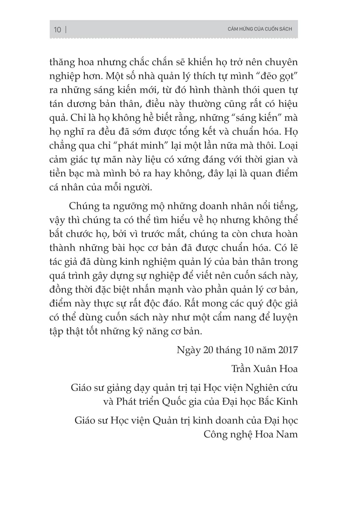 Khi mới bắt đầu có thể còn chưa quen, bạn sẽ cảm thấy chỉ bằng tự do thoải mái phát huy nhưng sau một thời gian dài, bạn sẽ trở thành một người có kỹ năng lãnh đạo đó! Charlie Munger (tỷ phú đầu tư nổi tiếng, hiện là Phó Chủ tịch tập đoàn Berkshire Hathaway, cánh tay phải của Warren Buffett) đã từng nói trong lúc chơi Golf, bạn không thể chỉ chơi dựa vào bản năng mà phải học một chút kỹ năng chuyên nghiệp, đối với những việc khác cũng như vậy. Nếu bất cứ điều gì bạn cũng tùy ý, không dồn tâm sức luyện tập thì bạn sẽ mãi mãi sống ở tầng chót. Cuốn sách này, chính là cẩm nang lãnh đạo cho bạn.