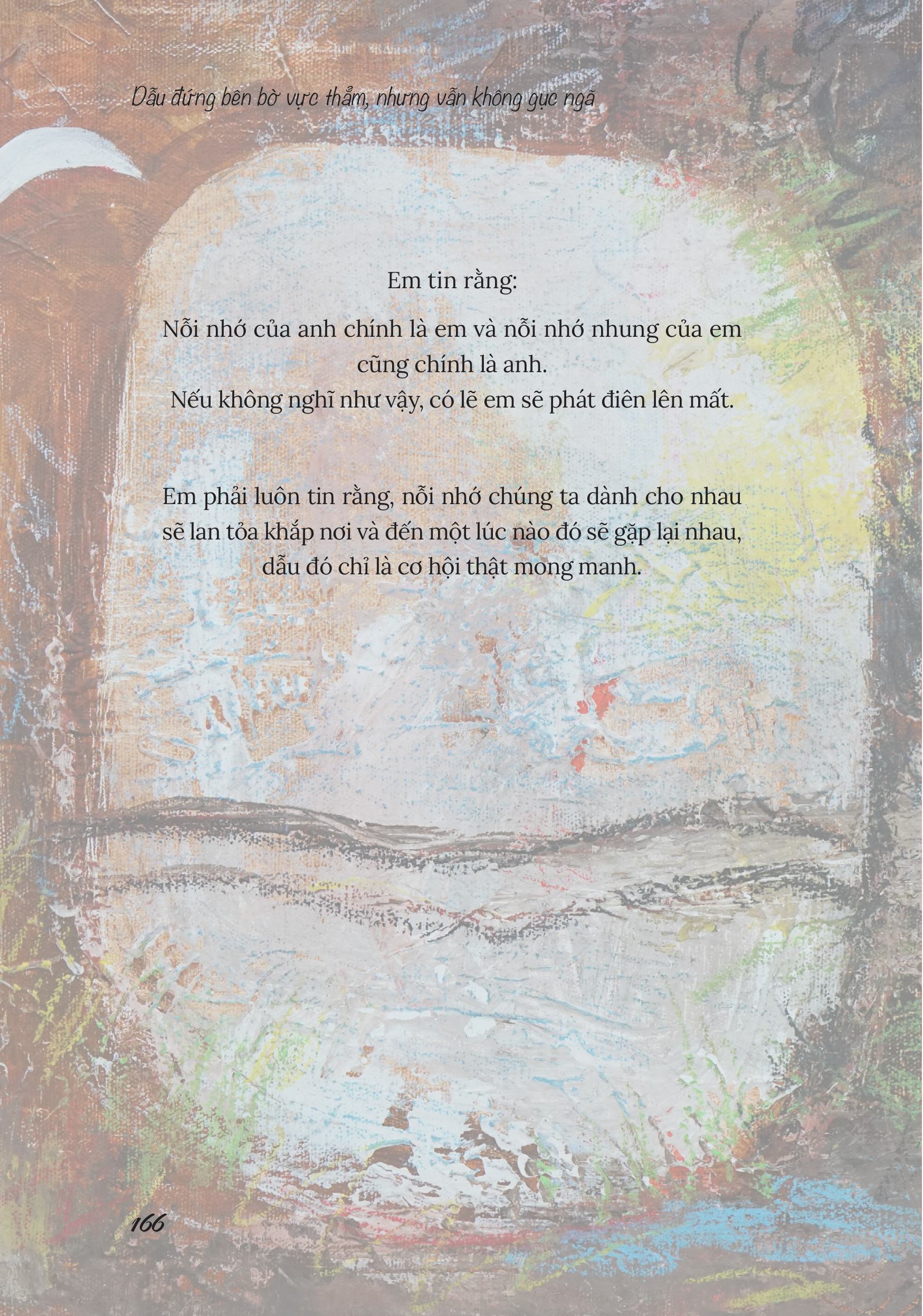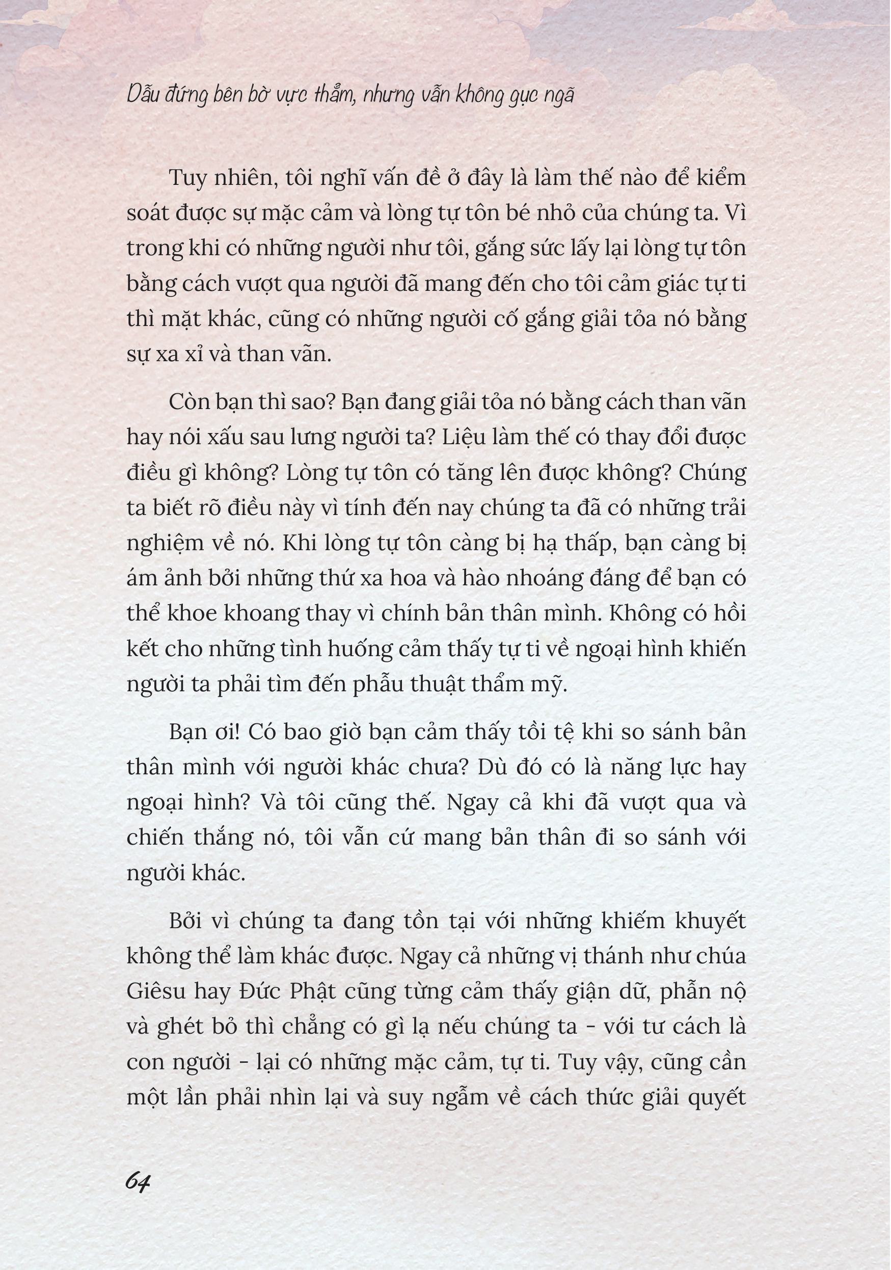 - Số trang: 252 trang GIỚI THIỆU SẢN PHẨM Cuộc sống không phải lúc nào cũng bằng phẳng, và đôi khi chúng ta phải đối diện với những thử thách, khó khăn tưởng chừng không thể vượt qua. Nhưng chính trong những khoảnh khắc tưởng chừng tuyệt vọng ấy, chúng ta lại tìm thấy sức mạnh tiềm ẩn để đứng lên, không gục ngã. "Dẫu Đứng Bên Bờ Vực Thẳm, Nhưng Vẫn Không Gục Ngã" là một tác phẩm đầy cảm hứng, khám phá hành trình vượt qua khổ đau, thử thách, và cả những giới hạn của chính mình. Tác giả mang đến cho người đọc những câu chuyện sâu sắc, những lời khích lệ mạnh mẽ, giúp ta nhận ra rằng, dù có rơi vào những hoàn cảnh khó khăn nhất, chỉ cần kiên trì và có niềm tin, chúng ta vẫn có thể vươn lên và thay đổi cuộc đời. Thông qua những trang sách này, bạn sẽ tìm thấy những câu chuyện thật sự ý nghĩa, những bài học quý giá về sức mạnh tinh thần, sự kiên cường, và khả năng hồi phục. Đừng bao giờ từ bỏ, dù có đứng ở bờ vực thẳm, bởi chỉ cần bạn còn hy vọng, bạn sẽ tìm thấy con đường đi tiếp. MỘT SỐ HÌNH ẢNH THAM KHẢO CAM KẾT