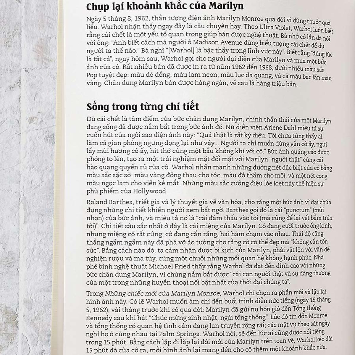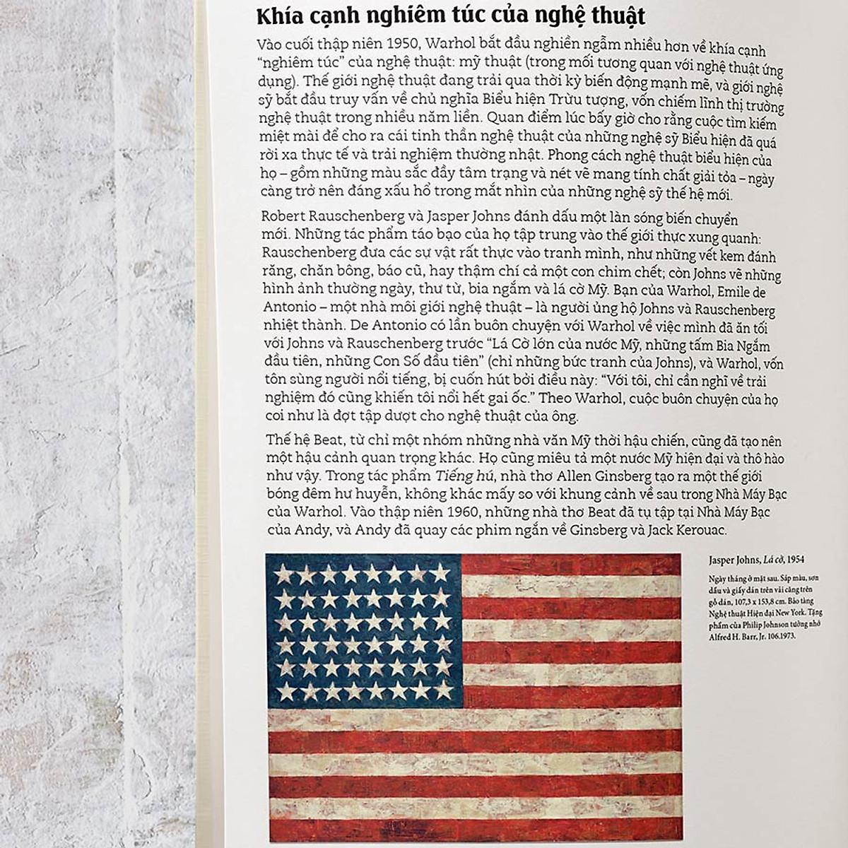 Bên cạnh câu chuyện về cuộc đời Warhol, cuốn sách cung cấp hình ảnh và rất nhiều thông tin thú vị về các tác phẩm nổi tiếng của ông, như Các lon xúp Campbell’s sao chép chính xác 32 lon xúp đủ vị, hay những bức tranh in ngôi sao Marilyn được in lặp lại nhiều lần, Ethel Scull ba mươi sáu lần, Mao (Mao Trạch Đông)… tất cả đều trong những màu sắc pop lòe loẹt đặc trưng, và bởi thế, cũng gây nhiều tranh cãi.