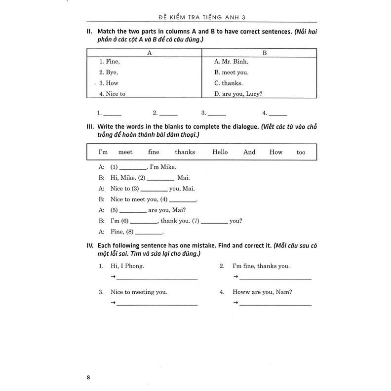 Cuốn sách Đề Kiểm Tra Tiếng Anh 3 - Có Đáp Án (Biên Soạn Theo Chương Trình GDPT Mới) này là một tài liệu cần thiết cho các em trong việc ôn tập và củng cố kiến thức để chuẩn bị cho các bài kiểm tra đánh giá thường xuyên và các bài kiểm tra, cuối kì môn Tiếng Anh lớp 3.