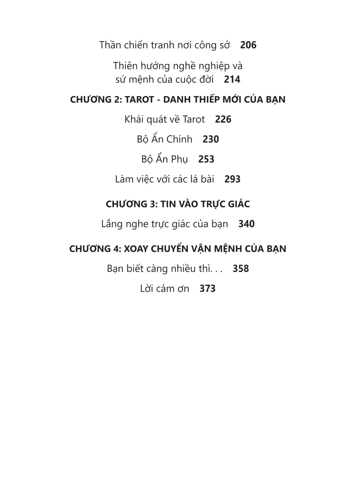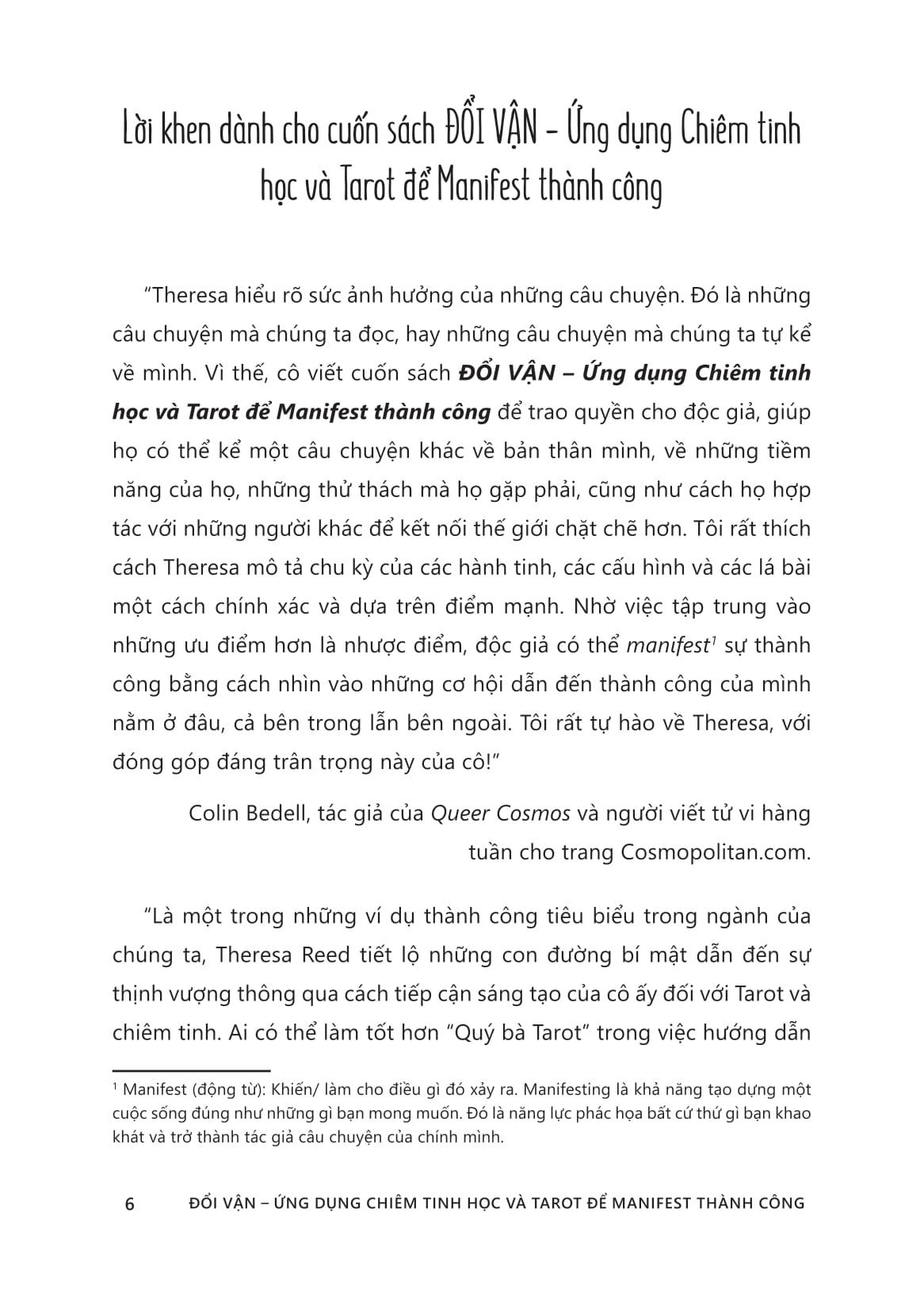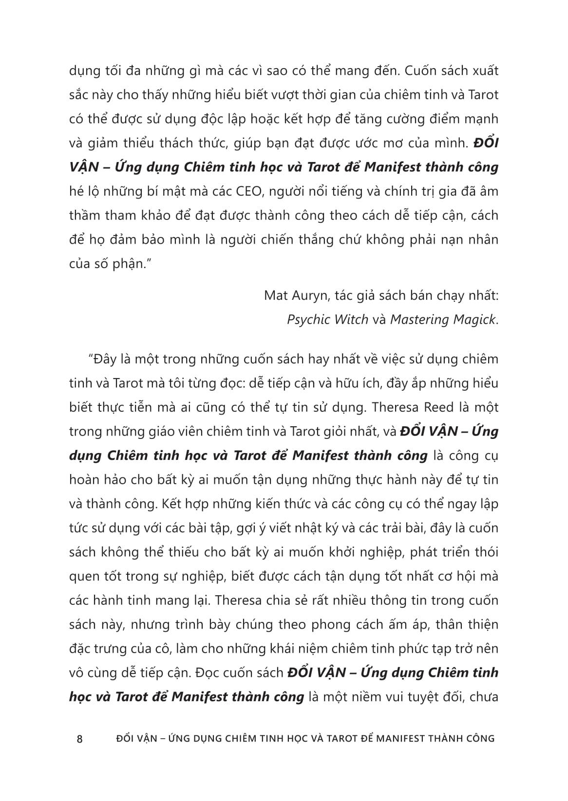 Trong ĐỔI VẬN – Ứng dụng Chiêm tinh học và Tarot để Manifest thành công, “Quý bà Tarot” Theresa Reed sẽ hướng dẫn bạn cách xây dựng con đường thành công bằng cách sử dụng chiêm tinh và Tarot để khai phá, đánh thức những tiềm năng độc đáo của bản thân và những thử thách bạn sẽ gặp trong hành trình cuộc đời. Cuốn sách này sẽ giúp bạn: