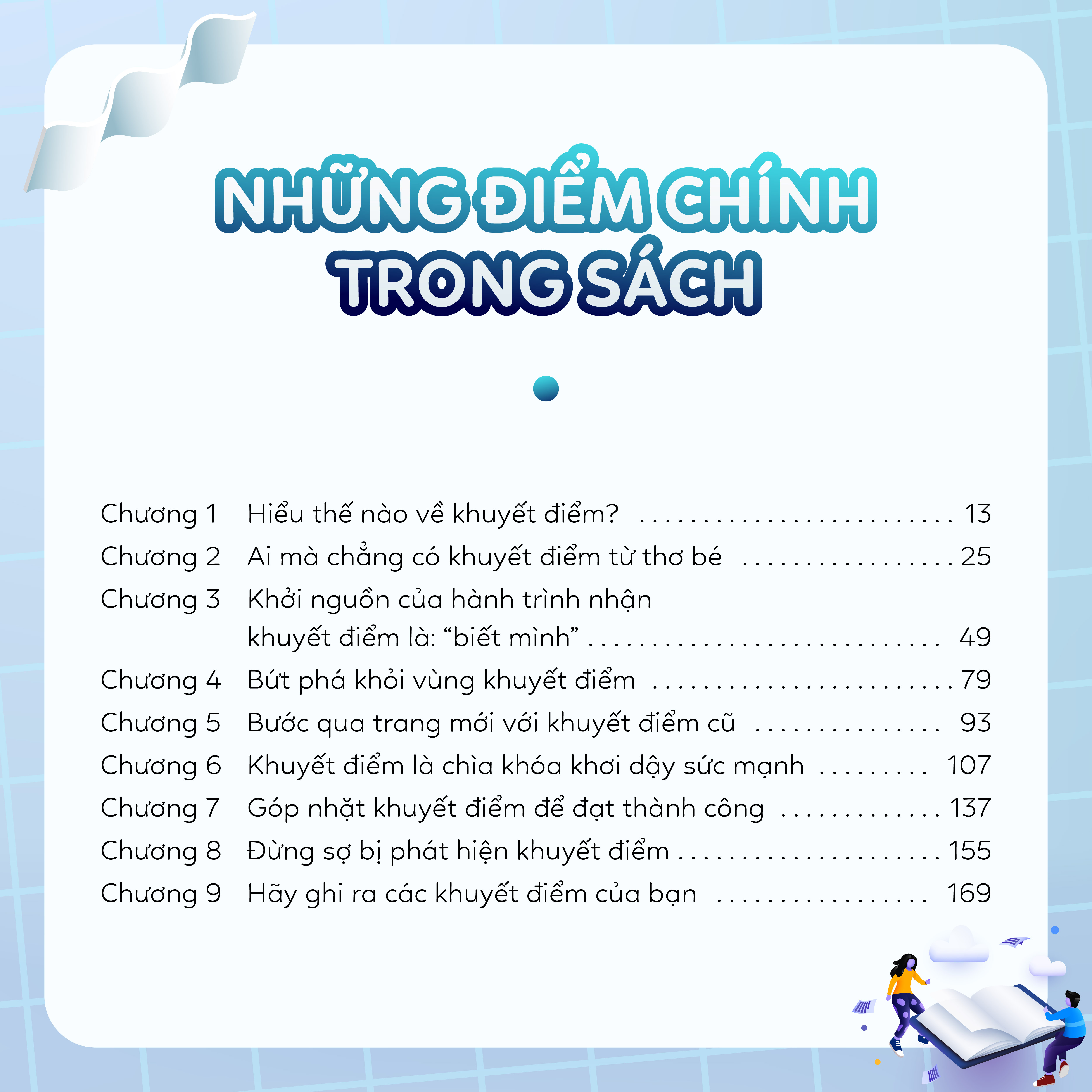 ĐỪNG SỢ BỊ PHÁT HIỆN KHUYẾT ĐIỂM Nhận ra khuyết điểm để biến chúng thành động lực Theo Thuyết tâm lý xã hội của nhà tâm lý học người Đức Erik Erikson, cuộc sống của mỗi người được chia thành các giai đoạn phát triển với nhiệm vụ cụ thể. Mỗi giai đoạn đều liên quan đến thách thức và những nhiệm vụ cơ bản mà một cá nhân cần hoàn thành để phát triển toàn diện. Điều này có thể cung cấp một góc nhìn sâu hơn về việc hiểu và xử lý khuyết điểm qua các giai đoạn của cuộc đời. Từ đó, làm cơ sở giúp chúng ta nắm bắt rõ hơn về cách khuyết điểm ảnh hưởng đến sự phát triển và cách tâm lý học có thể được áp dụng để khắc phục chúng. Vậy, khuyết điểm là gì? Tại sao chúng lại quan trọng? Khuyết điểm có thực sự xâm chiếm tư tưởng con người đến như vậy? Tìm hiểu ý nghĩa của việc nhận ra khuyết điểm và đường hướng nó thúc đẩy sự phát triển, từ đó hiểu và chấp nhận khuyết điểm, chúng ta sẽ nhìn nhận khuyết điểm với tinh thần xây dựng, và tập trung vào việc làm thế nào để biến chúng thành động lực. Khi thực sự thừa nhận khuyết điểm, yêu thương các khuyết điểm của bản thân và biến chúng thành niềm tự hào, bạn có thể xây dựng nền tảng vững chắc cho sự phát triển. Đừng sợ bị phát hiện khuyết điểm - Cuốn sách giúp bạn vượt qua giới hạn bản thân Trong cuộc hành trình đáng nhớ của cuộc sống, chúng ta thường tập trung quan tâm những ưu điểm, những thành tựu rực rỡ. Chúng ta ước mơ về tương lai tỏa sáng với những thành công mà quên mất thực chất chúng ta cũng chỉ là những con người “nhân vô thập toàn” với những khuyết điểm riêng biệt của mỗi cá nhân. Mỗi sai lầm quá khứ trong cuộc đời đều góp phần tạo nên những đặc điểm riêng biệt và sự phức tạp của từng người. Cuốn sách này được viết ra với mong muốn chia sẻ các kỹ năng tâm lý học có thể giúp bạn thức tỉnh bản thân nếu chẳng may rơi vào bế tắc, thông qua việc chia sẻ những câu chuyện kém may mắn của chính bản thân tác giả. Ai cũng có khuyết điểm. Nếu bạn vẫn thiếu can đảm bước ra khỏi ra vùng an toàn, chưa đủ dũng cảm để bộc bạch các khuyết điểm của mình thì cũng không sao cả. Hãy lắng nghe tác giả trong cuốn sách này tự vạch trần khuyết điểm của mình trước. So với sự chịu đựng và âm thầm lau nước mắt vì bế tắc, thì việc chia sẻ các khuyết điểm của bản thân với ai đó mà bạn tin cậy sẽ giúp chúng ta dễ thở hơn, chẳng có gì đáng xấu hổ cả. Những khuyết điểm ấy chẳng hoàn hảo, nhưng chúng là tài sản tinh thần trong hành trình trưởng thành, là chiếc chìa khóa mở ra nguồn sức mạnh tiềm ẩn giúp bạn vượt qua giới hạn của bản thân.