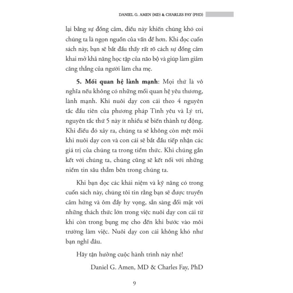 Dr. Daniel G. Amen (MD) Là bác sĩ tâm thần học lâm sàng và nhà sáng lập Amen Clinics, ông nổi tiếng với việc tiên phong sử dụng kỹ thuật chụp não SPECT để đánh giá và rối loạn tâm lý. Ông đã xuất bản hơn 30 đầu sách, trong đó nhiều cuốn là best-seller theo New York Times. Dr. Charles Fay (PhD) Là chuyên gia tâm lý giáo dục, đồng thời là người điều hành chương trình Love and Logic Institute. Ông có hơn 30 năm kinh nghiệm trong việc huấn luyện giáo viên và phụ huynh tại Mỹ, tập trung vào việc thiết lập ranh giới và nuôi dạy trẻ bằng phương pháp giáo dục tích cực nhưng có kỷ luật.