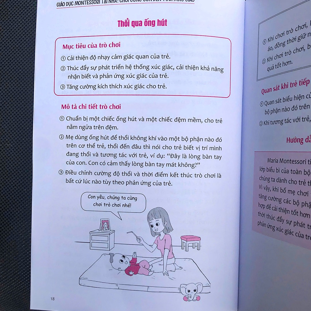 Sách: Giáo Dục Motessori Tại Nhà Maria Montessori từng nói:"Trẻ em sinh ra để học tập, phát triển cũng như cải thiện các hành vi, và chúng rất thích điều đó. Các nhà tâm lí học cho rằng trẻ em phải được vui chơi, bởi dưới sự trợ giúp của các trò chơi, sự phát triển của trẻ sẽ có xu hướng hoàn thiện hơn. Trẻ càng tâp trung cao độ thì càng kích thích đồng bộ giác gian, từ đó càng phát triển tư duy và hành động của mình." Giáo dục sớm theo phương pjasp Montessori bao gồm: