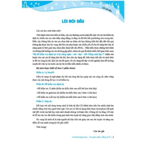 “Bộ đề kiểm tra định kỳ 4 kỹ năng nghe - nói - đọc - viết Tiếng Anh lớp 7” nhằm rèn luyện cho các em kĩ năng làm bài thi, làm chủ các dạng đề, hiểu được kết cấu và cách thức ra đề của từng kỳ thi. Khi các em đã quen với các dạng bài tập và trải nghiệm làm đề thường xuyên thì việc tự tin trước các kỳ thi là điều hiển nhiên có được.