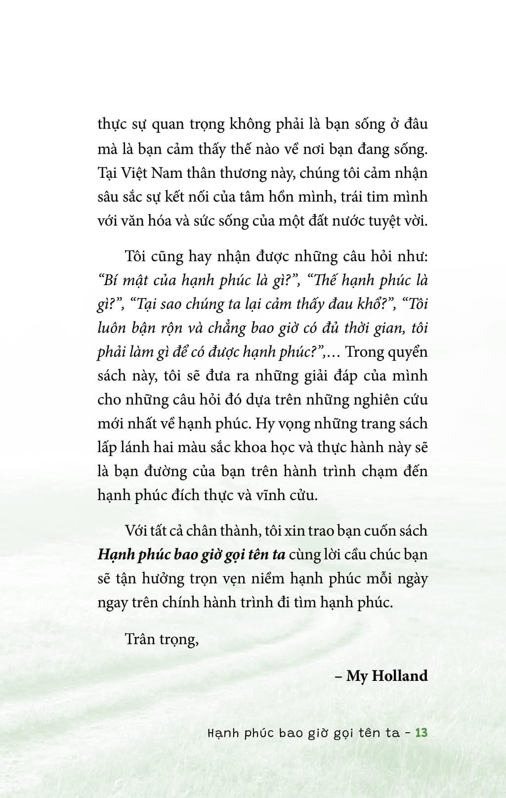Hạnh Phúc Bao Giờ Gọi Tên Ta Đã bao giờ bạn tự hỏi: “Mình có đang hạnh phúc không?”. Câu hỏi này không hề… vớ vẩn chút nào đâu. Ai cũng có đầy đủ lý do để hạnh phúc nhưng sao rất nhiều người lại không cảm thấy hạnh phúc? Vì sao quá nhiều người bận rộn kiếm tìm hạnh phúc mà không hề nhận ra hạnh phúc đang hiển hiện ngay trước mắt? Cuốn sách "Hạnh Phúc Bao Giờ Gọi Tên Ta" của tác giả My Holland là một hành trình khám phá sâu sắc về khái niệm hạnh phúc và cách để từng bước xây dựng nó trong cuộc sống hằng ngày. Được viết bằng giọng văn chân thành, gần gũi, cuốn sách không chỉ mang đến những lý thuyết về tâm lý học mà còn là những trải nghiệm thực tế, bài học quý giá từ chính cuộc sống của tác giả. Cuốn sách được chia thành nhiều chương, mỗi chương đi sâu vào một chủ đề cụ thể, từ việc định nghĩa hạnh phúc đến cách nâng cao cảm xúc tích cực và phát triển tính cách. Tác giả My Holland mở đầu bằng những câu hỏi sâu sắc: "Hạnh phúc là gì?" và "Vì đâu hạnh phúc xa tầm với?" Qua đó, độc giả sẽ nhận ra rằng hạnh phúc không phải là một đích đến mà là một hành trình. Một trong những điểm nổi bật của cuốn sách là sự phân biệt giữa hạnh phúc và cảm giác hài lòng. Tác giả nhấn mạnh rằng hạnh phúc thực sự đến từ việc cảm nhận và trân trọng những gì m.ình đang có, thay vì luôn tìm kiếm những điều tốt hơn. Điều này giúp độc giả nhận ra giá trị của những khoảnh khắc giản dị trong cuộc sống. My Holland cũng chỉ ra rằng tính cách đóng vai trò quyết định trong việc cảm nhận hạnh phúc. Các chương về việc tự nâng ngưỡng hạnh phúc của bản thân và phát triển những tính cách tích cực như sự vị tha, lòng biết ơn, và tinh thần lạc quan là những phần rất đáng chú ý. Tác giả khuyến khích độc giả tìm kiếm và nuôi dưỡng những phẩm chất tốt đẹp bên trong m.ình để từ đó tạo nên nguồn hạnh phúc bền vững. Không chỉ dừng lại ở khía cạnh cá nhân, cuốn sách này còn mở rộng ra môi trường làm việc. Tác giả đưa ra những bí quyết giúp độc giả tìm kiếm hạnh phúc trong công việc, điều này rất quan trọng trong thế giới hiện đại, nơi mà nhiều người cảm thấy căng thẳng và không hài lòng với công việc của m.ình. Qua những câu chuyện thực tế và nghiên cứu khoa học, My Holland chỉ ra rằng một nhân viên hạnh phúc sẽ cống hiến hết m.ình cho công việc, từ đó tạo ra môi trường làm việc tích cực và hiệu quả. Ngoài ra, cuốn sách còn cung cấp những lời khuyên thực tiễn và dễ áp dụng trong cuộc sống hàng ngày, từ việc thực hành lòng biết ơn, rèn luyện thể dục thể thao, đến việc chăm sóc sức khỏe tinh thần thông qua thiền định và các hoạt động xã hội. Những hoạt động này không chỉ giúp cải thiện chất lượng cuộc sống mà còn tạo ra những kết nối tích cực với những người xung quanh. "Hạnh Phúc Bao Giờ Gọi Tên Ta" là một cuốn sách không thể bỏ qua cho những ai đang tìm kiếm sự bình yên trong tâm hồn và hạnh phúc thực sự. Tác phẩm này không chỉ dừng lại ở lý thuyết mà còn khuyến khích độc giả hành động và thực hiện những thay đổi tích cực trong cuộc sống. Cuốn sách chắc chắn sẽ là một người bạn đồng hành quý giá trong hành trình khám phá bản thân và tìm kiếm hạnh phúc thực sự. Dù bạn là ai, bạn hoàn toàn có thể sống hạnh phúc. Cuốn sách này sẽ dẫn đường cho bạn
