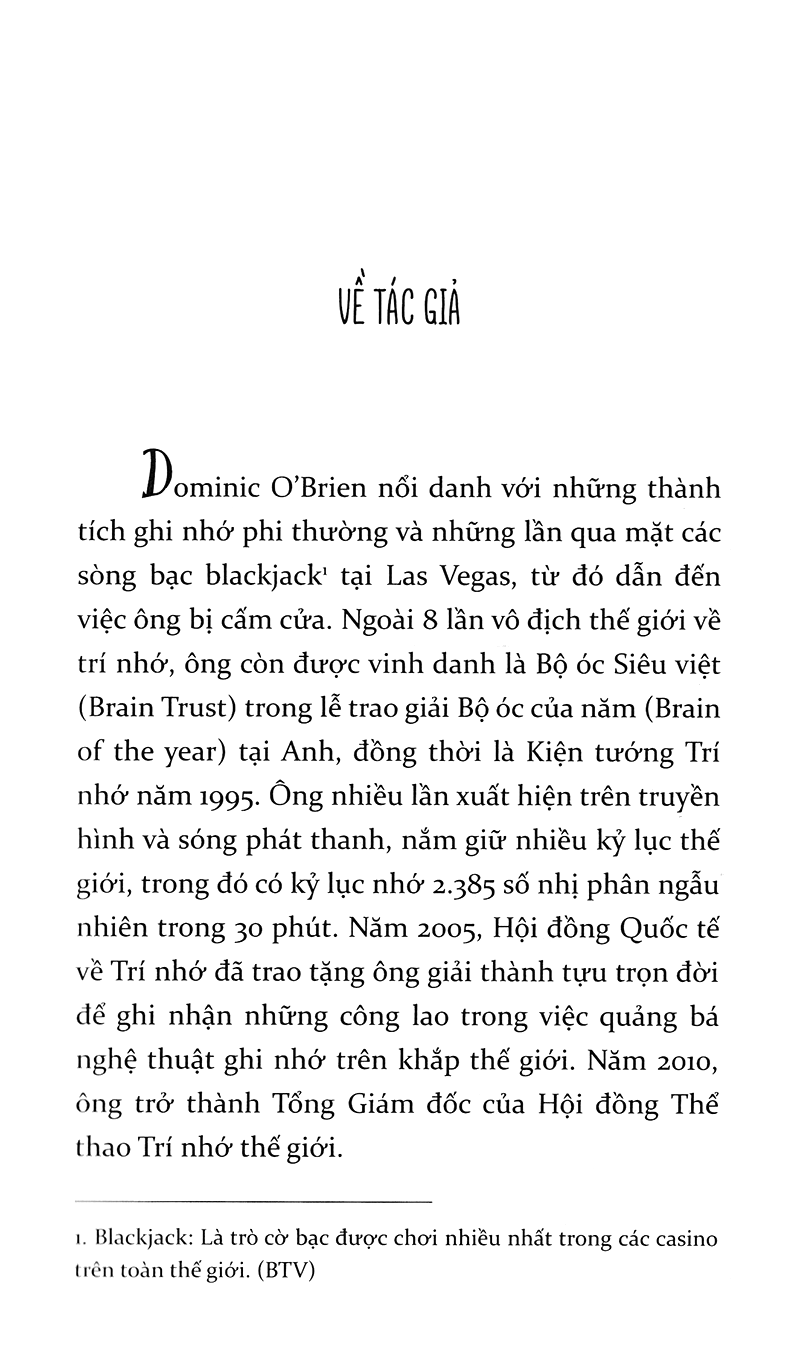 “Trong cuốn sách này, tôi muốn chỉ cho bạn cách rèn luyện trí nhớ. Mục đích không chỉ để thành thạo những bài tập não bộ mà bạn chưa bao giờ nghĩ là mình có thể làm được, mà còn là đòn bẩy giúp tăng sự tự tin của bạn, cũng giống như tôi vậy. Khi bạn đã có ý niệm về tiềm năng bên trong trí nhớ của mình, thì bạn cũng sẽ sớm nhận ra tiềm năng đó còn có thể áp dụng cho những mặt khác của não bộ, từ khả năng tập trung và phản xạ nhanh nhạy (hay còn gọi là “trí thông minh mềm”) cho đến sự tự tin khi kể chuyện, khi diễn thuyết và thậm chí là cả khả năng ứng biến.
