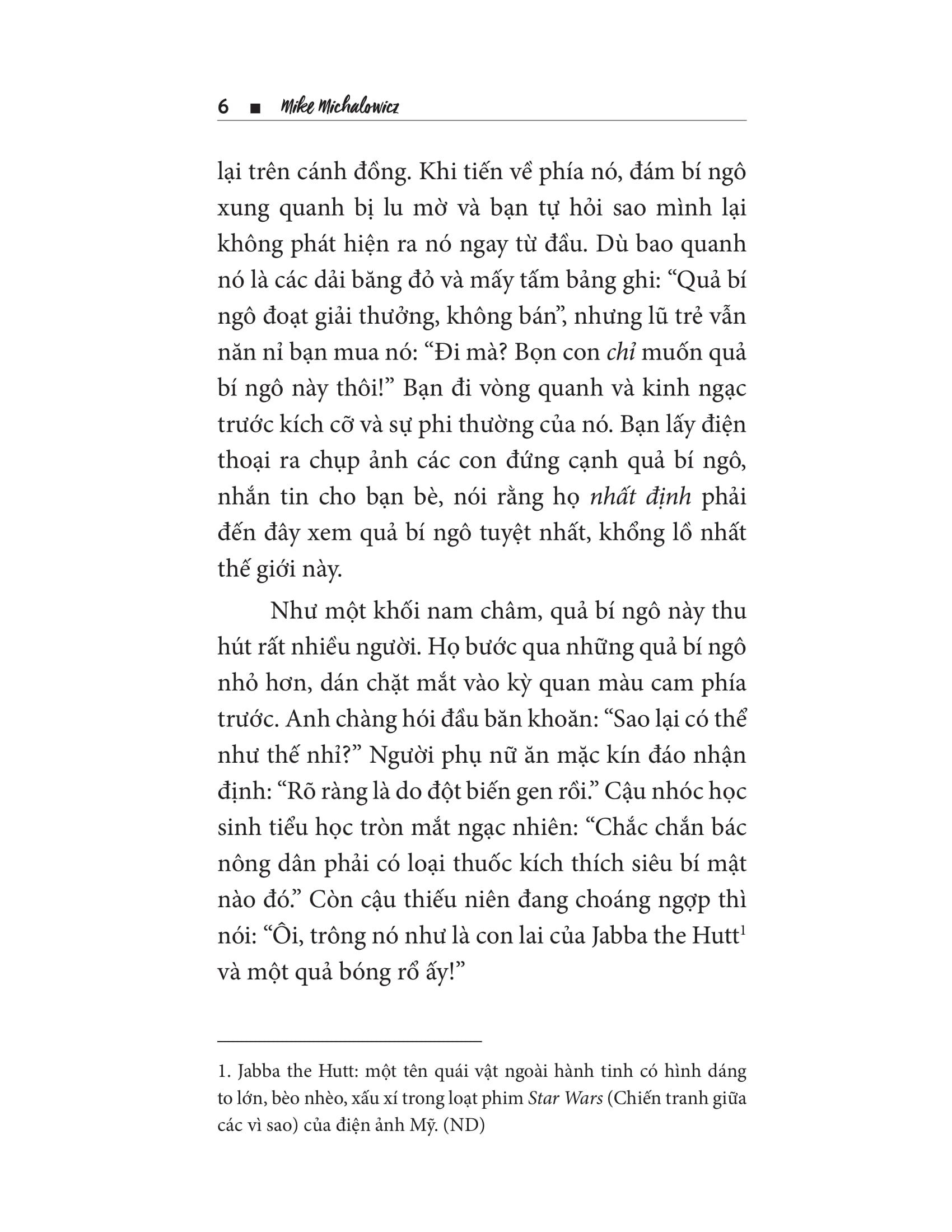 • Các sinh viên chuẩn bị bước vào thị trường lao động, những nhân viên, bất cứ ai mong muốn đóng góp điều gì đó có ý nghĩa cho thế giới này. THÔNG TIN TÁC GIẢ Mike Michalowicz Trước tuổi 35, ông đã thành lập và bán thành công hai công ty trị giá hàng triệu đô-la. Ông sáng lập Profit First, một công cụ được hàng trăm nghìn công ty trên toàn cầu sử dụng để thúc đẩy lợi nhuận. Ông là tác giả của nhiều đầu sách như: Fix This Next, Surge, The Pumpkin Plan, Profit First và The Toilet Paper Entrepreneur. Ông từng là chuyên gia bình luận về doanh nghiệp nhỏ cho tờ The Wall Street Journal và dẫn chương trình giải cứu doanh nghiệp trên MSNBC. Mike là diễn giả chính nổi tiếng trên các diễn đàn về chủ đề khởi nghiệp sáng tạo, đồng thời còn là diễn giả khách mời cho các chương trình khởi nghiệp tại các trường đại học như Columbia, Copenhagen Business School, Emerson, Harvard, Penn State, Pepperdine và Princeton. ĐÁNH GIÁ/ NHẬN XÉT CỦA BÁO CHÍ/CHUYÊN GIA “Mỗi trang, mỗi chương, khi đọc cuốn sách này, tôi đều tự hỏi, sao m.ình lại không nghĩ ra nhỉ? Thật đáng kinh ngạc! Quả là một cuốn sách tuyệt vời. Một quả bí ngô! Ai mà ngờ được chứ? Tất cả các doanh nhân, chủ doanh nghiệp, hãy đọc nó đi! Hãy làm ngay đi!” —Michael Gerber, tác giả của The E-Myth và là người sáng tạo ra The E-Myth Evolution “Một cuốn sách tuyệt vời khác của Mike Michalowicz! Sự hài hước ngẫu hứng và hiểu biết sâu sắc về kinh doanh của Mike đảm bảo rằng Kế hoạch bí ngô là một cuốn sách mà các doanh nhân nên đọc trong nhiều năm tới.”—Guy Kawasaki, tác giả của Enchantment và The Art of the Start “Những lời khuyên sâu sắc, thẳng thắn hướng đến những doanh nhân đang mắc kẹt giữa sự chung chung thay vì cụ thể, có ý nghĩa. Rất nhiều hạt giống đáng để gieo trồng.”—Seth Godin, tác giả của Con bò tía “Michalowicz lại một lần nữa thành công rực rỡ. Kế hoạch bí ngô tràn ngập sự hài hước tuyệt vời của Mike và là một hướng dẫn từng bước phi thường dành cho những doanh nhân đang gặp khó khăn trong việc phát triển kinh doanh.”—J. J. Ramberg, người dẫn chương trình Your Business của MSNBC “Với phong cách ‘điên rồ như cáo’, Mike Michalowicz tiết lộ lý do tại sao việc bắt chước một người nông dân trồng bí ngô lại mang đến cho bạn thành công vượt trội. Michalowicz đang nhanh chóng trở thành một trong những tác giả kinh doanh sáng tạo nhất thời đại.”—Rieva Lesonsky, Giám đốc điều hành của GrowBiz Media, cựu biên tập viên tạp chí Entrepreneur “Mike giúp việc biến doanh nghiệp của bạn từ bình thường thành phi thường trở nên dễ dàng như làm theo một công thức đơn giản từng bước. Cuốn sách này hé lộ những kiến thức và sự thông thái mà tôi hiếm khi thấy trong các tác phẩm trước đây. Nếu bạn chỉ đọc một cuốn sách trong năm nay, hãy chọn Kế hoạch bí ngô.”—Bob Burg, đồng tác giả của The Go-Giver và Endless Referrals TRÍCH ĐOẠN “Kinh doanh không phải là một cuộc ganh đua về danh tiếng. Đừng bận tâm về việc phải có được nhiều khách hàng nhất. Hãy gây dựng một doanh nghiệp có thể đáp ứng nhu cầu của những khách hàng tốt nhất... phù hợp với bạn nhất. Bạn không cần phải được bầu chọn làm nữ hoàng của buổi dạ tiệc, mà chỉ cần một nhóm bạn thân thiết với tính cách tuyệt vời và tấm lòng kiên định, những người sẵn sàng làm mọi thứ vì bạn, cũng như bạn luôn sẵn sàng vì họ. Hãy luôn là chính m.ình và đừng bao giờ thỏa hiệp.” “Bạn cần nhớ một điều rằng, cũng như trong một vườn bí ngô, việc diệt trừ cỏ dại là một quá trình không ngừng nghỉ. Các công ty đều sẽ thay đổi và khách hàng cũng có kẻ đi người đến. Khi đã nắm được cách thực hiện, cứ mỗi quý, bạn hãy lập một Bảng đánh giá mới. Hãy dành riêng một hoặc hai ngày để đánh giá khách hàng và đưa ra những quyết định khó khăn mà giờ đây đã trở nên quen thuộc. Bạn sẽ chẳng bao giờ biết khi nào thì một cọng cỏ dại đáng ghét hay một quả bí ngô nhiễm bệnh sẽ lẻn vào thôn tính toàn bộ khu vườn của bạn đâu.” “Trong nhiều năm qua, tôi đã phát triển được Bộ ba câu hỏi, tuy đơn giản nhưng lại vô cùng hiệu quả. Nếu được hỏi theo đúng thứ tự, ba câu hỏi này sẽ giúp nhân viên suy nghĩ và đưa ra những quyết định luôn có lợi nhất cho công ty của bạn. Vì chúng rất hiệu quả, nên có lẽ bạn sẽ muốn in một bản các câu hỏi này ra và dán chúng lên bàn làm việc của từng nhân viên... Đây là Bộ ba câu hỏi, sắp xếp đúng thứ tự: