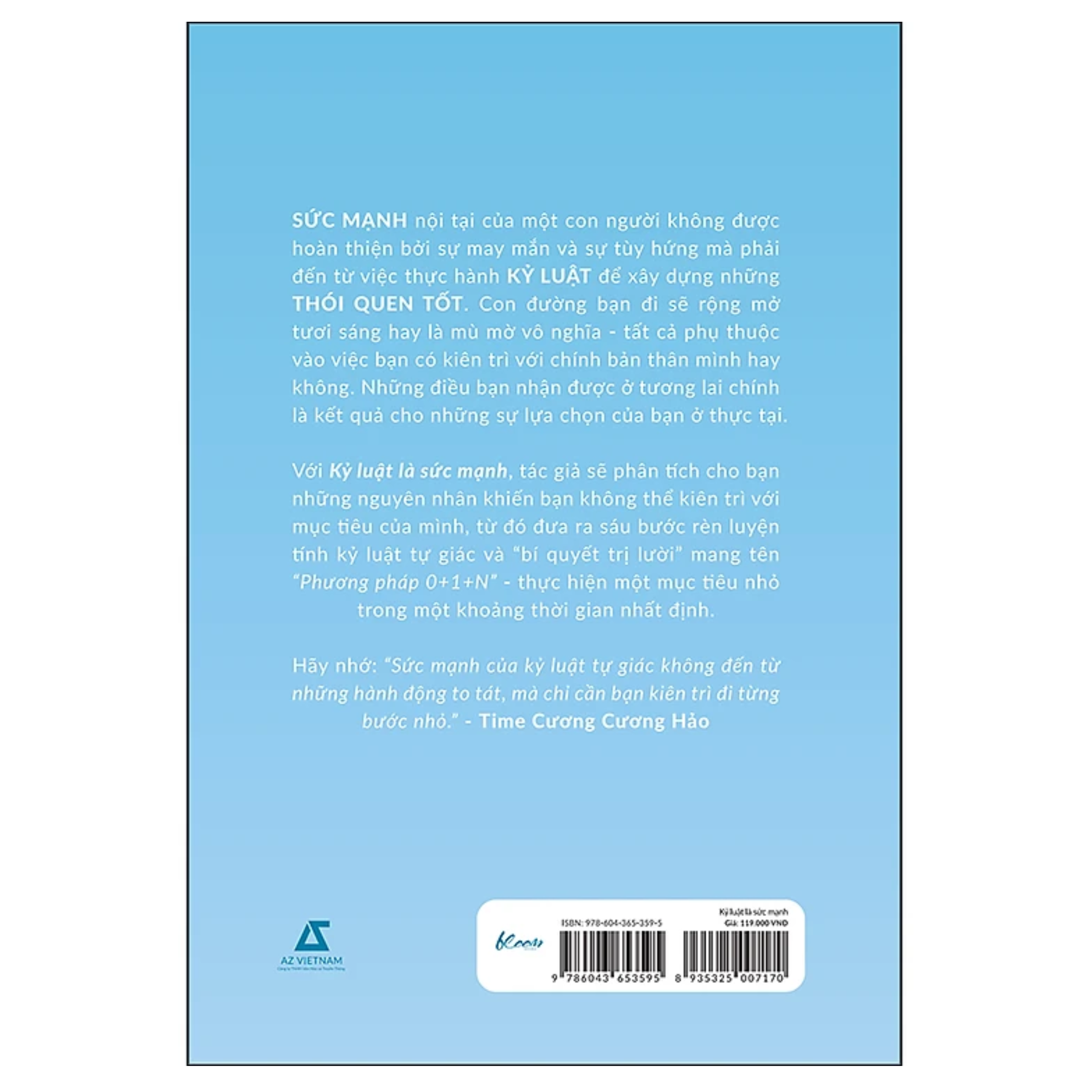 Với cuốn sách Kỷ luật là sức mạnh, tác giả sẽ phân tích cho bạn những nguyên nhân khiến bạn không thể kiên trì với mục tiêu của mình, từ đó đưa ra sáu bước rèn luyện tính kỷ luật tự giác và “bí quyết trị lười” mang tên “Phương pháp 0+1+N” - thực hiện một mục tiêu nhỏ trong một khoảng thời gian nhất định.
