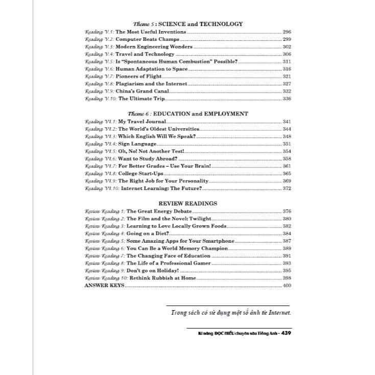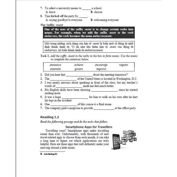 Công ty phát hành Nhà Sách Hồng Ân 2 Năm Xuất Bản 2024 Kích Thước17 x 24 cm Nhà Xuất bản Đại Học Quốc Gia hà Nội Số Trang 439 Bìa Mềm Tác Giả Lưu Hoằng Trí Sách - Kĩ Năng Đọc Hiểu Chuyên sâu Tiếng Anh (dùng chung cho các bộ sgk hiện hành) - HA Các em học sinh, sinh viên thân mến! Kĩ năng đọc hiểu có một vai trò quan trọng đối với người học tiếng Anh nói chung, đối với sinh viên Đại học, và học sinh Trung học phổ thông nói riêng. Nhằm giúp các em làm tốt bài thi, chúng tôi giới thiệu những kĩ năng đọc hiểu từ cơ bản đến nâng cao. Khi các em đã có những kĩ năng cần thiết thì có thể làm các bài tập từ dễ đến khó. Do những yêu cầu trên, chúng tôi trình bày mỗi bài đọc kèm theo ba phần luyện tập sau đây: A. Reading Comprehension (Đọc hiểu) gồm 8 câu hỏi trắc nghiệm với 4 phương án lựa chọn. B. Reading Skill (Kĩ năng đọc hiểu) trình bày lần lượt các kĩ năng đọc, trong đó các kĩ năng đọc cơ bản được rèn luyện nhiều lần. C. Vocabulary Practice (Luyện tập từ vựng) giúp học viên mở rộng vốn từ vựng, có kĩ năng đoán được từ mới dựa trên ngữ cảnh cũng như ôn luyện về căn ngữ, tiền tố, và hậu tố trong Tiếng Anh. Các bài đọc được chia thành những chủ đề thường gặp trong các đề thi như: Our Society (Xã hội của chúng ta); Our Culture (Nền văn hóa của chúng ta); Our Nature and Environment (Thiên nhiên & Môi trường); Our Health and Medicine (Sức khỏe & Y học); Science and Technology (Khoa học & Công nghệ); Education and Employment (Giáo dục & Việc làm). Sau cùng là Review Readings (Các bài đọc ôn luyện). Chúng tôi hi vọng cuốn sách này với 100 bài đọc hiểu sẽ là một tài liệu tự học bổ ích và thiết thực dành cho những người học tiếng Anh nói chung cũng như các em học sinh chuẩn bị tốt cho các kì thi tiếng Anh. Măc̣ dù tác giả đa ̃ có nhiều cố gắng trong quá trình biên soaṇ , song cuốnsách k hông thể tránh khỏi thiếu sót. Chúng tôi rất mong nhận được những đóng góp quý báu của các bạn đồng nghiệp và các em học viên để cuốn sách được hoàn thiện hơn trong lần tái bản sau.