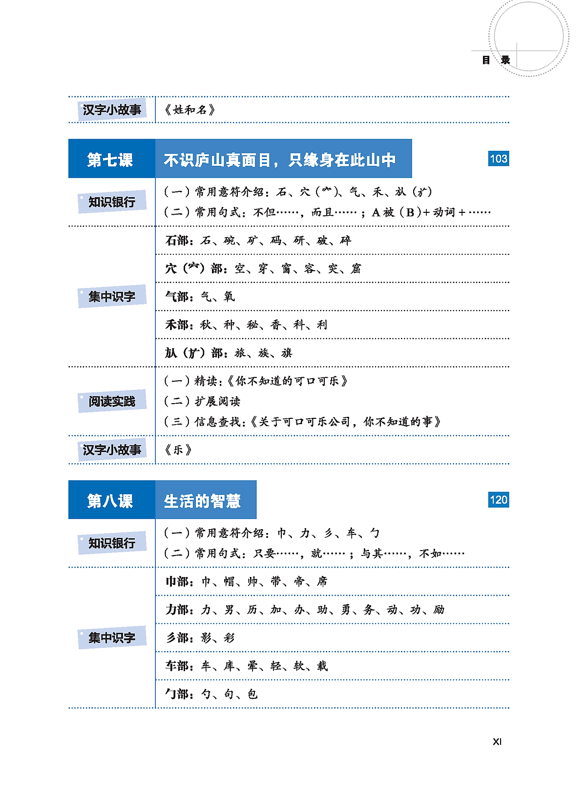 - Ngân hàng tri thức Mảng này giảng giải những tri thức cơ sở về chữ Hán, đồng thời thiết kế phần “Luyện tập” để kiểm tra tình hình lý giải và nắm bắt của học sinh. Phần giảng giải đơn giản, rõ ràng, dễ hiểu, có kèm theo phần dịch tiếng Việt, điều này giúp người học giảm bớt tâm trạng ngại khó khi học chữ Hán, nắm được phương pháp học tập chính xác, nâng cao hứng thú và hiệu suất học tập. Bài 1 và bài 2 chủ yếu giới thiệu về các nét chữ và quy tắc bút thuận của chữ Hán. Bài 3 đến bài 7 giới thiệu về cấu tạo cơ bản của chữ Hán, giảng giải một cách hệ thống về chữ tượng hình, chữ chỉ sự, chữ hội ý và chữ hình thanh; phần chữ hình thanh được chia thành hai bài, một bài chủ yếu giảng giải về ý phù (hình bàng), một bài chủ yếu giảng giải về thanh phù (thanh bàng). Bài 8 giảng giải về ba hiện tượng chữ cận hình, chữ đồng âm và chữ đa âm tồn tại trong tiếng Hán. Bài 9 giới thiệu về mối quan hệ giữa chữ Hán và từ.