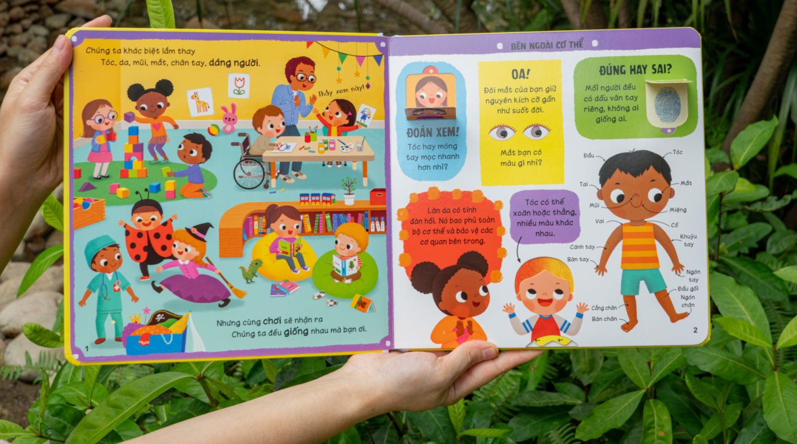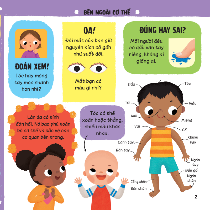 Cuốn sách phù hợp với phổ tuổi rộng từ 3-6 tuổi. 3-4 tuổi con tập trung kích thích giác quan và khám phá kiến thức cơ bản qua hoạt động Lật-Mở miếng ghép. 5-6 tuổi con được khuyến khích hiểu cơ thể và áp dụng các bài học kỹ năng chăm sóc, vệ sinh, bảo vệ bản thân.