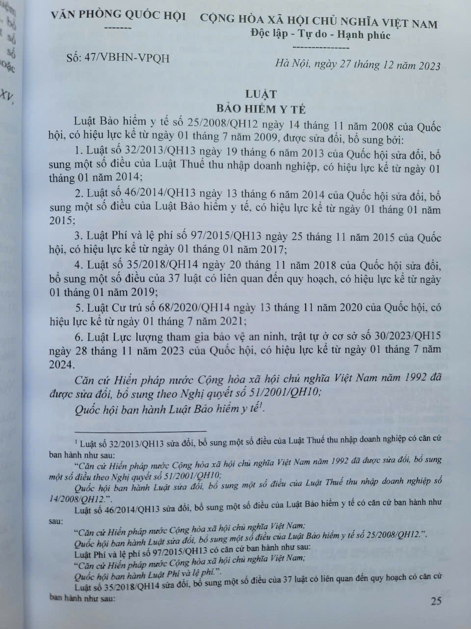 Ngày 27 tháng 11 năm 2024 Quốc hội đã biểu quyết thông qua Luật số 51/2024/QH15 sửa đổi, bổ sung một số điều của Luật Bảo hiểm y tế (gọi tắt là Luật Bảo hiểm y tế sửa đổi, bổ sung 2024), nhằm tiếp tục thể chế hóa quan điểm, chủ trương của Đảng và tăng cường sự lãnh đạo, quản lý của Nhà nước về công tác bảo hiểm y tế. Đồng thời, khắc phục hạn chế, vướng mắc, bất cập của Luật Bảo hiểm y tế hiện hành và đáp ứng yêu cầu thực tiễn khách quan trong tình hình mới. Bảo đảm an sinh xã hội, quyền, lợi ích của người tham gia bảo hiểm y tế, cơ sở khám bệnh, chữa bệnh, từng bước giảm tỷ lệ chi trực tiếp từ tiền túi của người tham gia bảo hiểm y tế; quản lý, sử dụng hiệu quả quỹ bảo hiểm y tế.