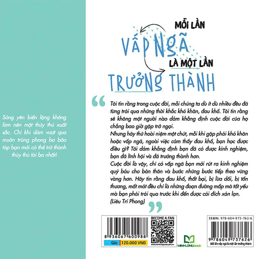 SÁCH: MỖI LẦN VẤP NGÃ LÀ MỘT LẦN TRƯỞNG THÀNH NXB: NXB Thanh Niên Kích thước : 14.5 x 20.5 cm Năm xuất bản : 2019 Số trang : 376 Khối lượng : 430 grams