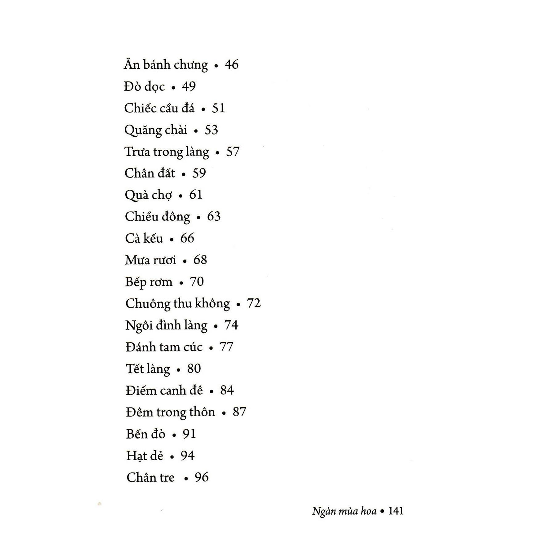 ĐọcNgàn Mùa Hoachúng ta không chỉ cảm nhận được nét đẹp của thiên nhiên mà còn cảm nhận được nét bình yên của nông thôn xưa. Chúng ta được nhìn ngắm lại làng quê Việt những năm 70, 80 của thế kỉ trước với những gian nhà lợp mái tranh mỗi khi trời mưa thì từng giọt, từng giọt tí tách như đuổi nhau từ mái nhà chạy xuống đất, chiếc cổng nhà bằng tre xanh vì“một số gia đình mở thêm trại, trổ lũy tre thành cái cổng riêng”, hay chiếc cổng làng rợp bóng“mát rượi vì lũy tre hai bên mọc sát vào vòm cổng”,