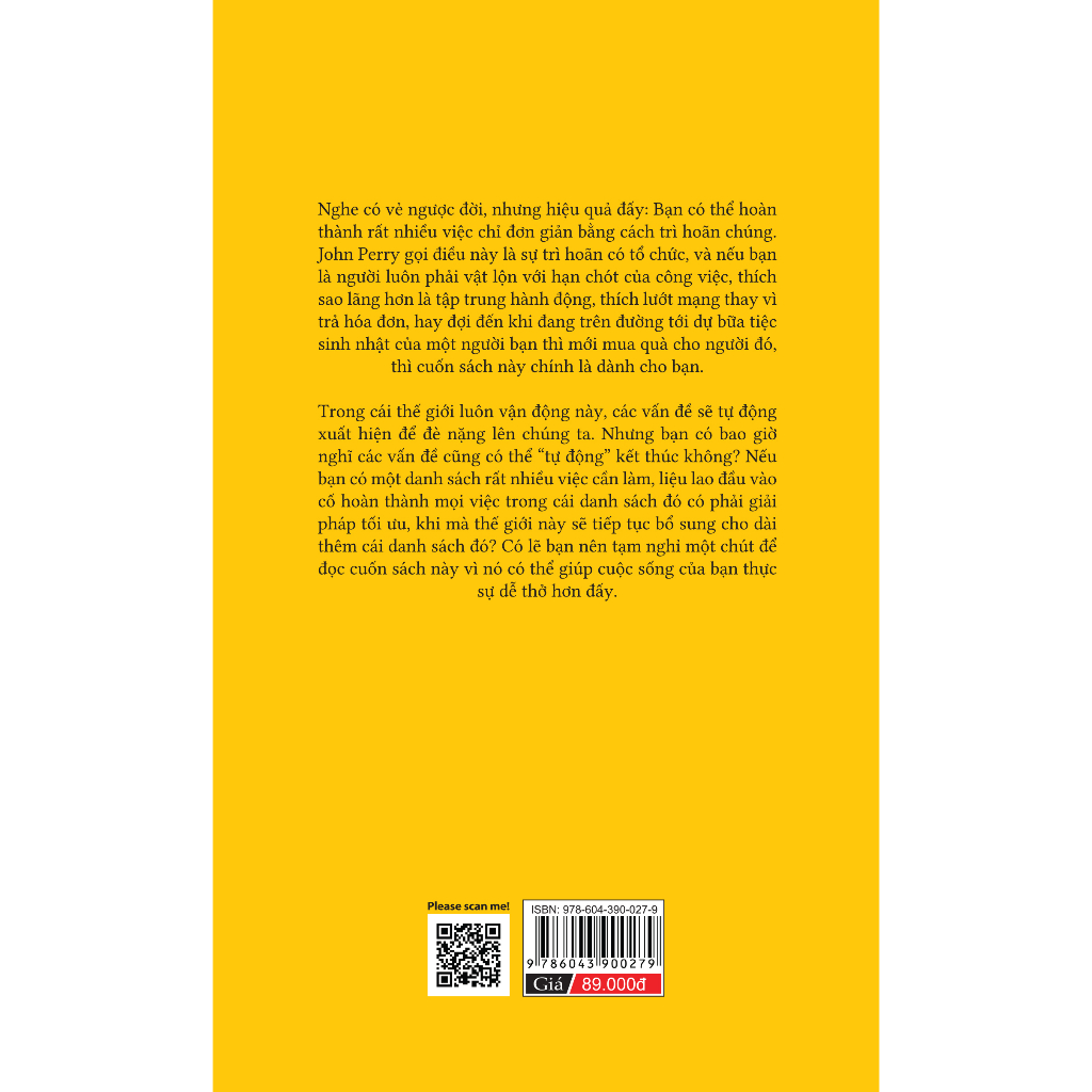 Công ty phát hành: Bách Việt Tên Sách: Nghệ thuật trì hoãn Nhà xuất bản: NXB Phụ Nữ Việt Nam Tác giả: John Perry Người dịch: Chinh Lương & Thanh Xuân Số trang: 140 Loại bìa: Bìa Mềm Ngày phát hành: 03/2023 Giới thiệu: Nghe có vẻ ngược đời, nhưng hiệu quả đây: Bạn có thể hoàn thành rất nhiều việc chỉ đơn giản bằng cách trì hoãn chúng. John Perry gọi điều này là sự trì hoãn có tổ chức và nếu bạn là người luôn phải vật lộn với hạn chót của công việc, thích sao lãng hơn là tập trung hành động, thích lướt mạng thay vì trả hóa đơn, hay đơi đến khi đang trên đường tới dự bữa tiệc sinh nhật của một người bạn thì mới mua quà cho người đó, thì cuốn sách này chính là dành cho bạn. Trong cái thế giới luôn vận động này, các vấn đề sẽ tự động xuất hiện để đè nặng lên chúng ta. Nhưng bạn có bao giờ nghĩ các vấn đề cũng có thể tự động kết thúc không? Nếu bạn có một dánh sách rất nhiều việc cần làm, liệu lao đầu vào cố hoàn thành mọi việc trong cái danh sách đó có phải giảia pháp tối ưu, khi mà thế giới này sẽ tiếp tục bổ dung cho dài thêm danh sách đó? Có lẽ bạn nên tạm nghỉ một chút để đọc cuốn sách này vì nó có thể giúp cuộc sống của bạn thực sự dễ thở hơn đấy
