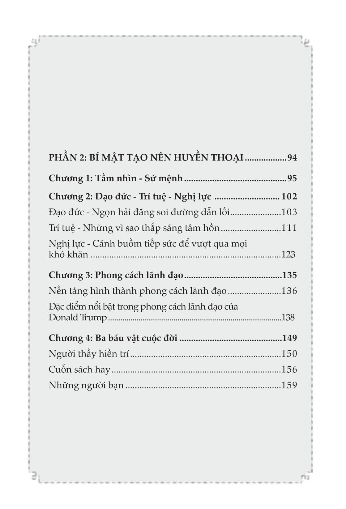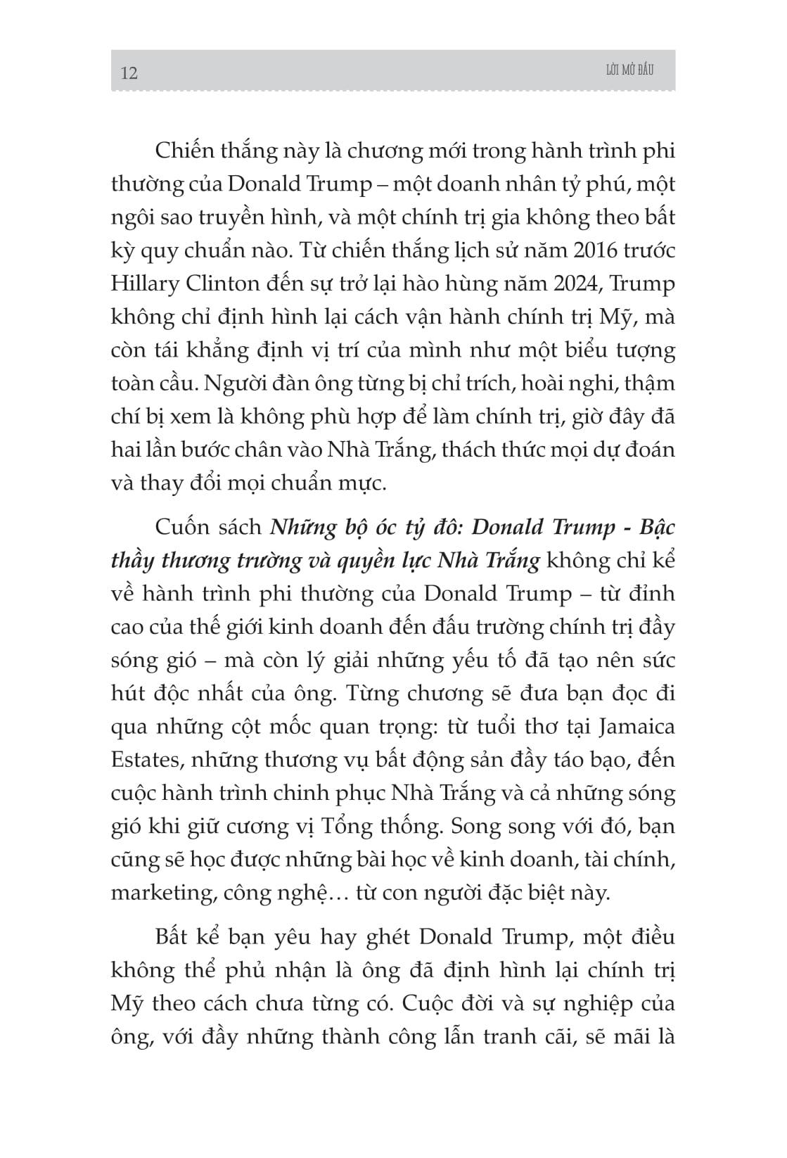 Những Bộ Óc Tỷ Đô - Donald Trump - Bậc Thầy Thương Trường Và Quyền Lực Nhà Trắng I. Từ thương trường đến chính trường Cuốn sách được chia thành 4 phần chính làm nổi bật cuộc đời và sự nghiệp của Donald Trump. Phần 1: Chân dung Donald Trump: Phần này dành để khắc họa chân dung toàn diện Donald Trump, từ thời niên thiếu, gia đình, sự nghiệp kinh doanh cho đến hành trình chinh phục chính trường Mỹ. Phần này cho thấy sự hình thành tính cách, tư duy và triết lý sống của Trump đã ảnh hưởng như thế nào đến sự nghiệp của ông. Bạn đọc sẽ được tìm hiểu về những thành viên trong gia đình Trump, nguồn gốc của sự giàu có, và những bài học ông rút ra từ những trải nghiệm trong cuộc đời. Phần 2: Bí mật tạo nên huyền thoại: Phần này đi sâu vào phân tích những yếu tố tạo nên thành công của Trump, bao gồm đạo đức, trí tuệ, nghị lực, và phong cách lãnh đạo đặc biệt của ông. Tác giả sẽ giải mã những bí quyết giúp ông vượt qua khó khăn, chinh phục thử thách, và đạt được những thành tựu phi thường. Bạn sẽ được tìm hiểu về tầm nhìn, sứ mệnh, giá trị cốt lõi, và những nguyên tắc sống của Trump, những yếu tố đã thúc đẩy ông vươn lên đỉnh cao. Phần 3: Chinh phục đỉnh cao: Phần này tập trung vào những bài học kinh doanh và chính trị mà bạn đọc có thể học hỏi từ Trump. Những bài học về tài chính, kinh doanh, marketing, quản lý nhân sự,... được phân tích một cách chi tiết, giúp bạn hiểu rõ hơn về chiến lược, tư duy và cách thức hoạt động của một doanh nhân và chính trị gia thành đạt. Bạn sẽ được làm quen với những chiến lược kinh doanh táo bạo, những quyết định mạo hiểm, và những bài học đắt giá từ những thành công và thất bại của Trump. Phần 4: Bài học nuôi dạy con đặc biệt: Phần này chia sẻ những nguyên tắc đặc biệt mà Donald Trump áp dụng trong việc giáo dục con cái. Bạn đọc sẽ được học hỏi về giá trị của lao động, sự tự lập, kỷ luật tài chính và triết lý sống mà Trump đã truyền lại cho con cái m.ình. Phần này cung cấp những bài học quý giá về cách nuôi dạy con cái, giúp con cái trưởng thành, tự lập và thành công. II. Điểm nổi bật của cuốn sách Khám phá tư duy chiến lược: Cuốn sách không chỉ dừng lại ở việc kể lại sự nghiệp của Trump, mà còn đi sâu phân tích tư duy chiến lược, cách ông tận dụng cơ hội, vượt qua thách thức, và đưa ra những quyết định táo bạo. Những bài học thiết thực: Những bài học về kinh doanh, chính trị, và quản lý con cái được đúc kết từ kinh nghiệm thực tế của Trump, mang tính ứng dụng cao. Phong cách lãnh đạo độc đáo: Cuốn sách hé lộ phong cách lãnh đạo đặc biệt của Trump, giúp bạn hiểu rõ hơn về những yếu tố tạo nên sức hút và sự thành công của ông. Hình ảnh chân thực: Cuốn sách khắc họa hình ảnh chân thực của Donald Trump, với cả những thành công lẫn tranh cãi, giúp bạn có cái nhìn khách quan hơn về nhân vật này. III. Bài học từ Donald Trump "Donald Trump - Bậc thầy thương trường và quyền lực Nhà Trắng" không chỉ là cuốn tiểu sử, mà còn là nguồn cảm hứng và bài học quý giá cho bất kỳ ai khao khát thành công. Bài học về kinh doanh: Cuốn sách cung cấp những bài học thực tiễn về kinh doanh, đầu tư, quản lý tài chính, marketing và xây dựng thương hiệu. Bài học về lãnh đạo: Từ phong cách lãnh đạo của Donald Trump, người đọc có thể rút ra những bài học về quản lý con người, xây dựng đội nhóm và tạo động lực cho nhân viên. Bài học về cuộc sống: Cuộc đời đầy thăng trầm của Donald Trump là minh chứng cho sức mạnh của nghị lực, ý chí và khát vọng vươn lên. Cuốn sách truyền cảm hứng cho người đọc vượt qua khó khăn, thử thách và không bao giờ từ bỏ ước mơ của m.ình. Những ai nên đọc cuốn sách này: Cuốn sách phù hợp với nhiều đối tượng độc giả, từ những người quan tâm đến lĩnh vực kinh doanh, chính trị, đến những người muốn tìm hiểu về phong cách lãnh đạo và sự nghiệp của một trong những nhân vật nổi bật nhất thế giới. "Donald Trump: Bậc thầy thương trường và quyền lực Nhà Trắng" không chỉ là một cuốn tiểu sử, mà còn là một nguồn cảm hứng, một cẩm nang thiết thực, và một bài học đầy giá trị cho những ai muốn vươn tới thành công trong cuộc sống. Hãy cùng khám phá cuốn sách này và tìm ra những bí quyết thành công riêng cho m.ình!
