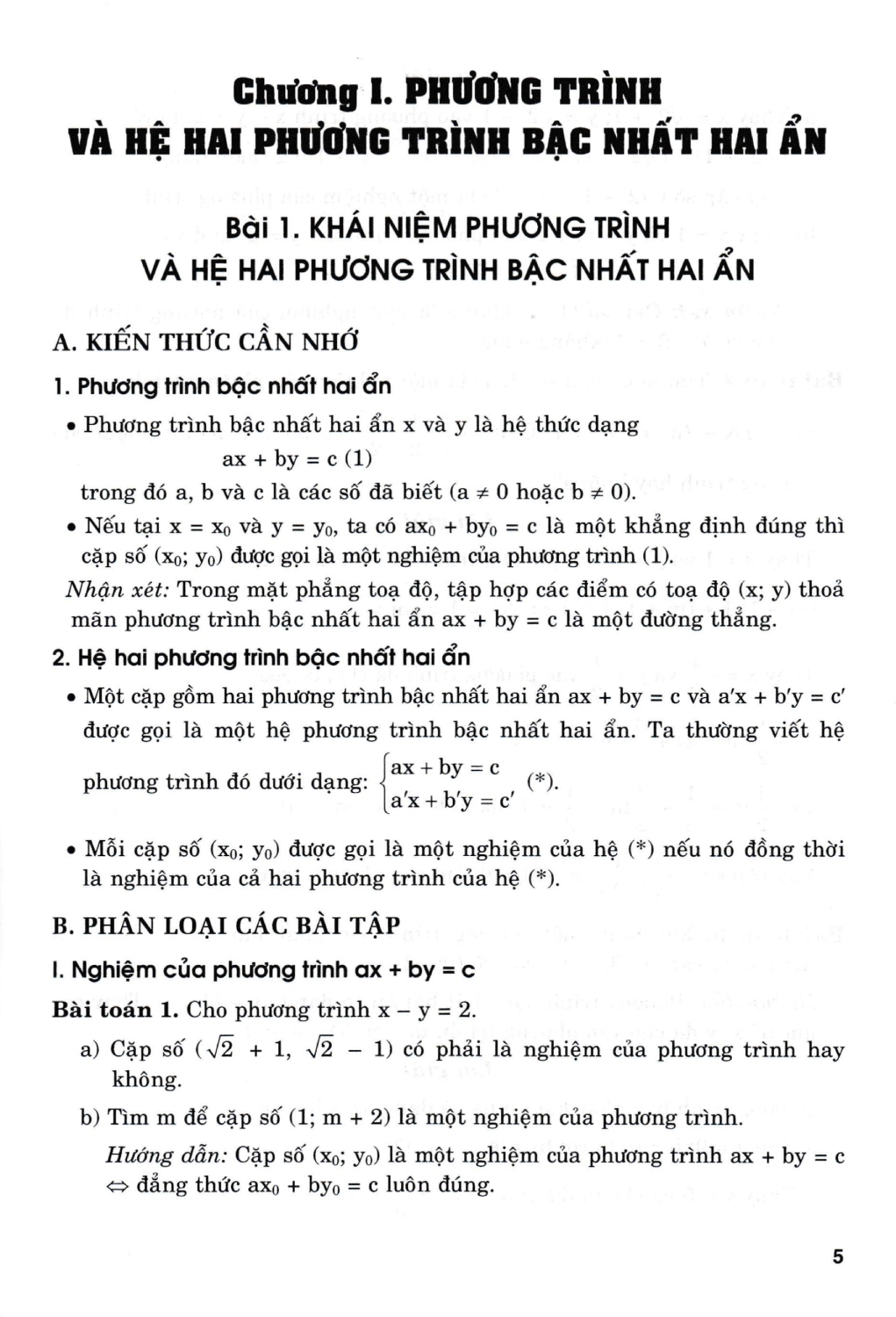 Các tác giả tự đặt ra cho mình nhiệm vụ phân chia những dạng bài tập có trong từng bài học để các em học sinh luyện tập và nắm vững các kĩ năng giải toán. Trong mỗi bài có tóm tắt các kiến thức cần nhớ, sau đó là từng dạng bài toán được đưa ra bằng nhiều ví dụ, có hướng dẫn giải cùng với lời giải chi tiết; sau mỗi bài toán còn có những ghi chú; các cách giải khác và bài toán tương tự, cuối cùng là các bài tập.