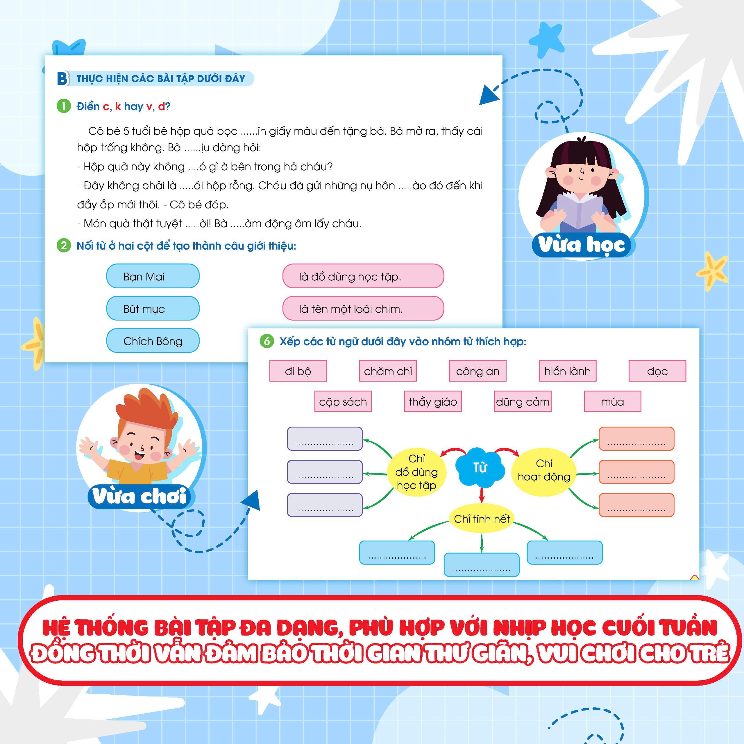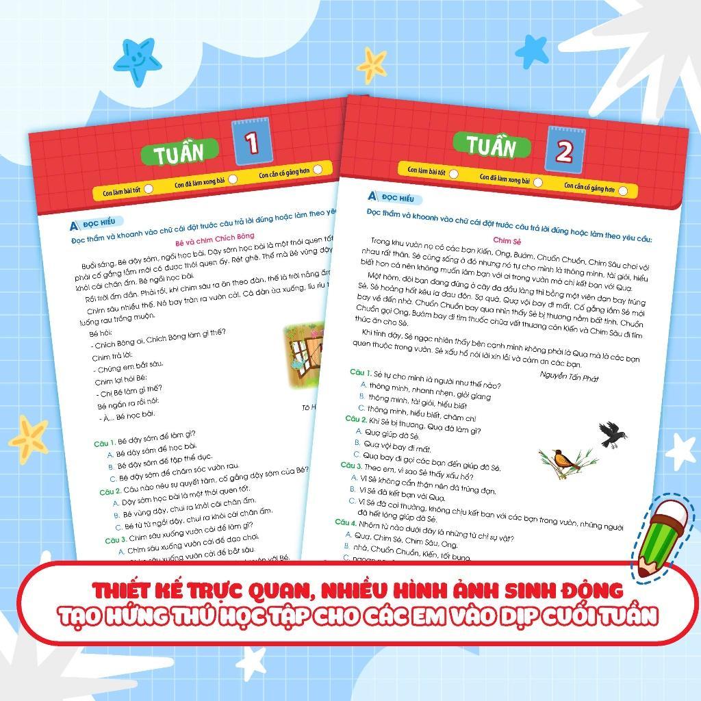 - Bố cục rõ ràng, hình ảnh sinh động Sách được thiết kế với bố cục dễ hiểu với nhiều hình ảnh và được in màu sinh động giúp các con hứng thú với việc học vào những ngày cuối tuần. Đặc biệt, sau mỗi kì sẽ có bài ôn tập giữa kì và cuối kì giúp con có tài liệu ôn tập cho các kì kiểm tra. Ngoài ra, phần đáp án phía sau giúp bố mẹ đánh giá năng lực, từ đó có phương pháp ôn luyện phù hợp cho con.